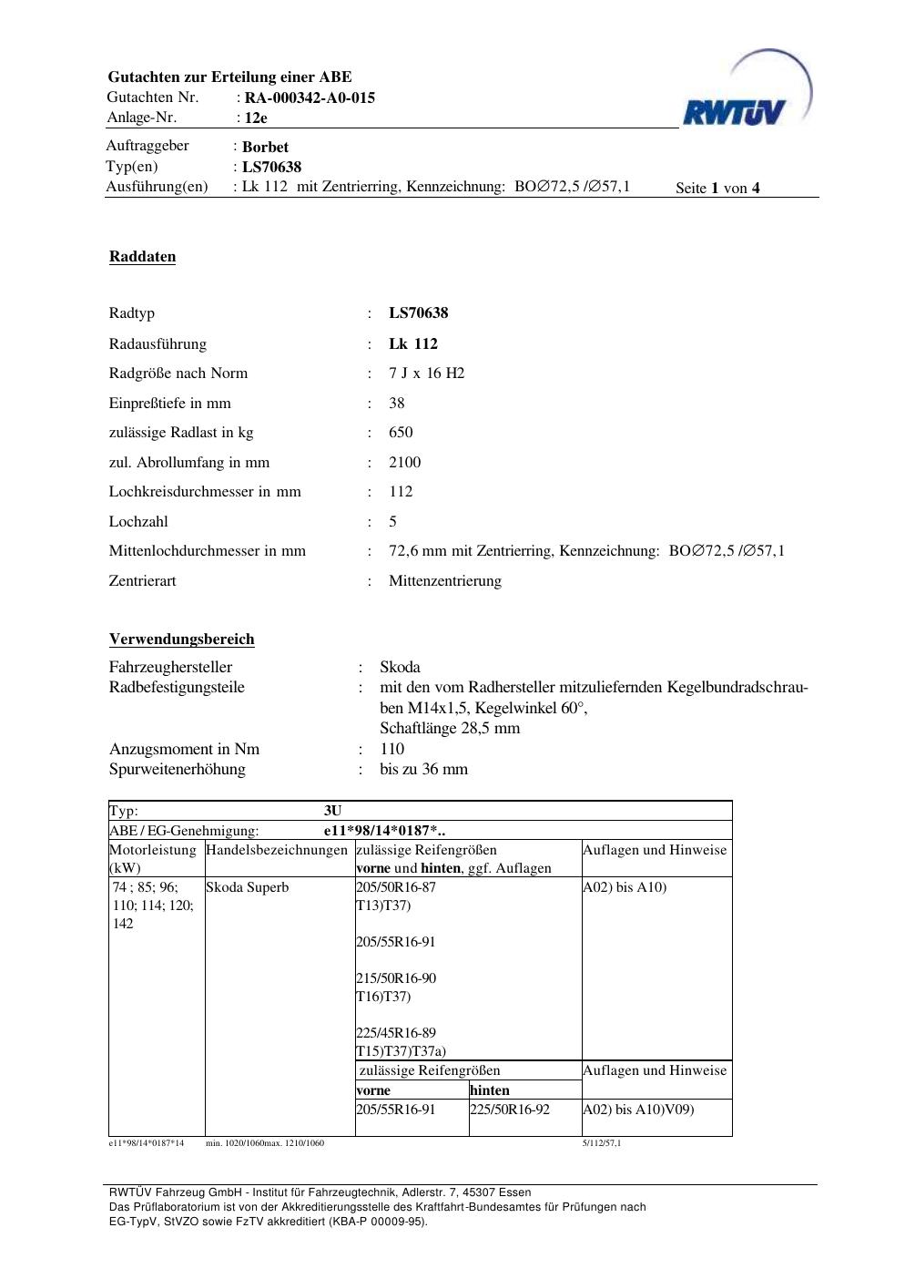 teilegutachten zur Borbet LS70638