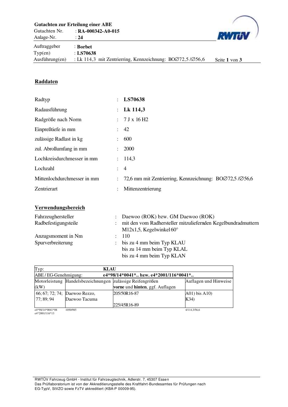 teilegutachten zur Borbet LS70638