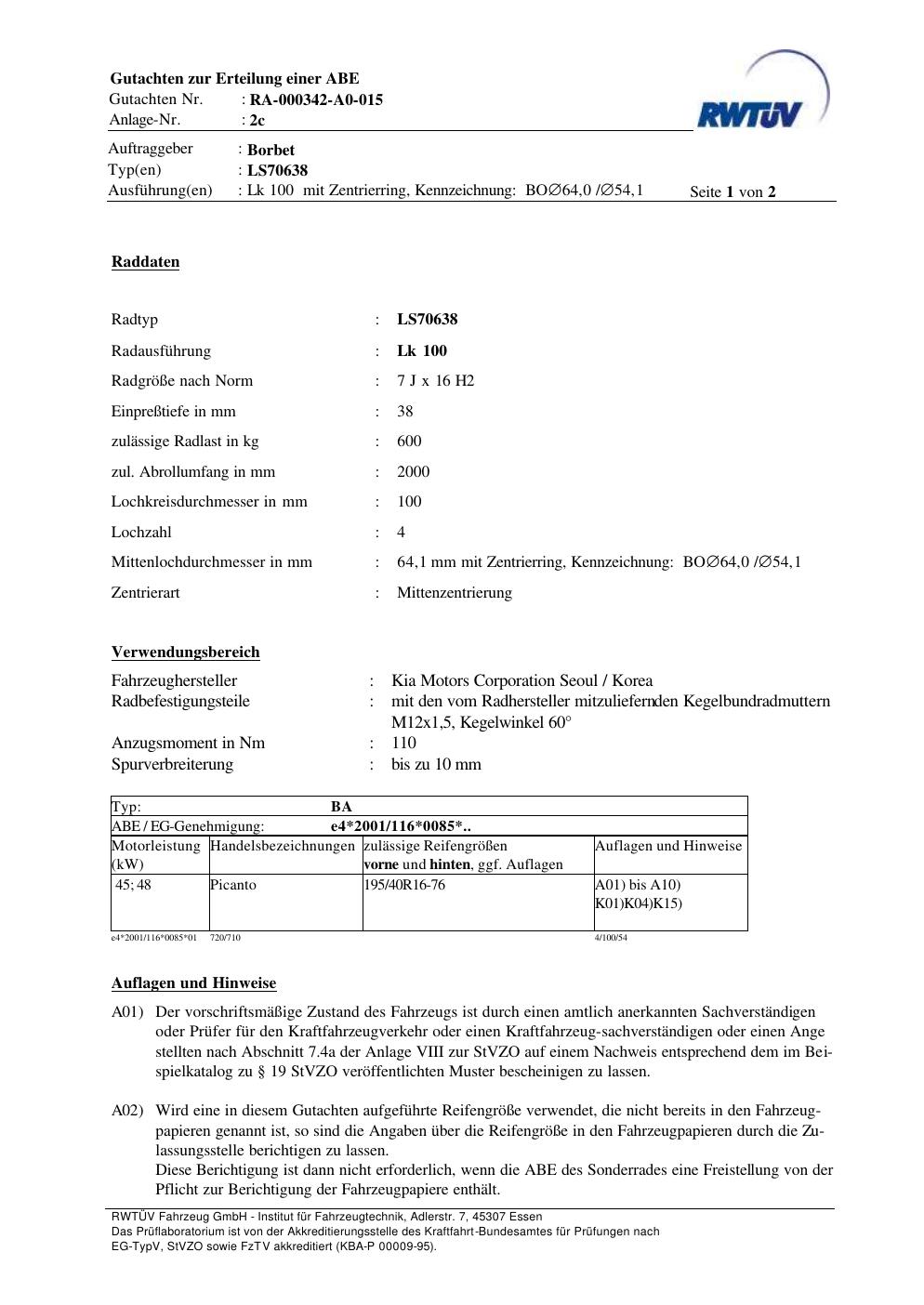 Dieses Gutachten (teilegutachten) bezieht sich auf die Alufelge Borbet LS70638 in der Ausführung ET 0, Mittenloch 0 mm . Im PDF findest du typischerweise zulässige Reifengrößen, Auflagen/Anbauhinweise und – je nach Dokument – Hinweise zur Eintragung.