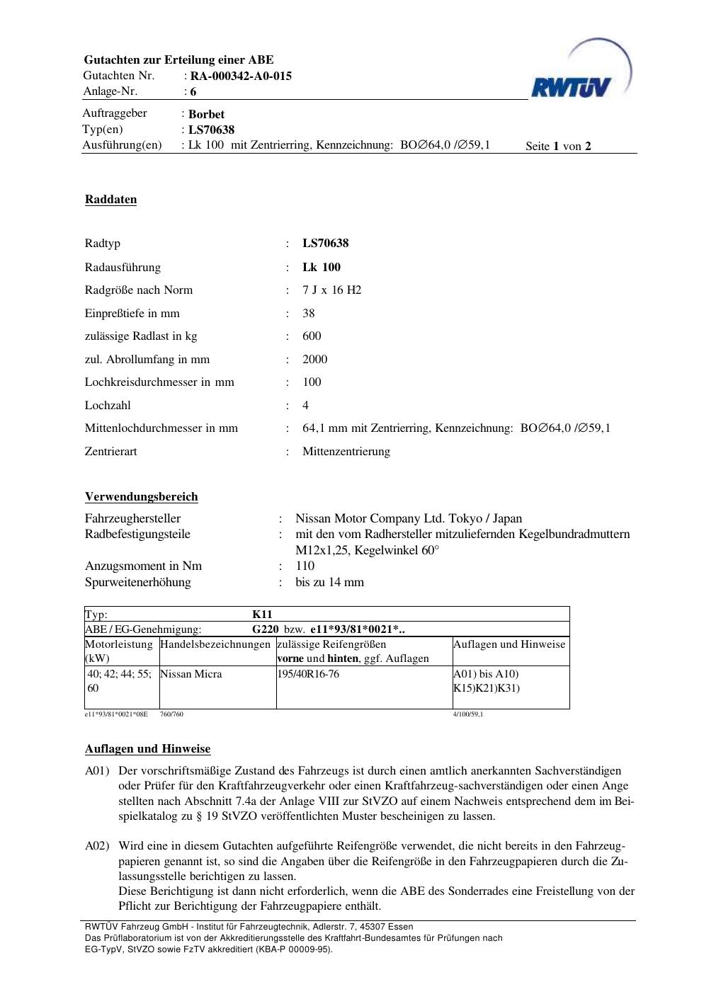 Dieses Gutachten (teilegutachten) bezieht sich auf die Alufelge Borbet LS70638 in der Ausführung ET 0, Mittenloch 0 mm . Im PDF findest du typischerweise zulässige Reifengrößen, Auflagen/Anbauhinweise und – je nach Dokument – Hinweise zur Eintragung.
