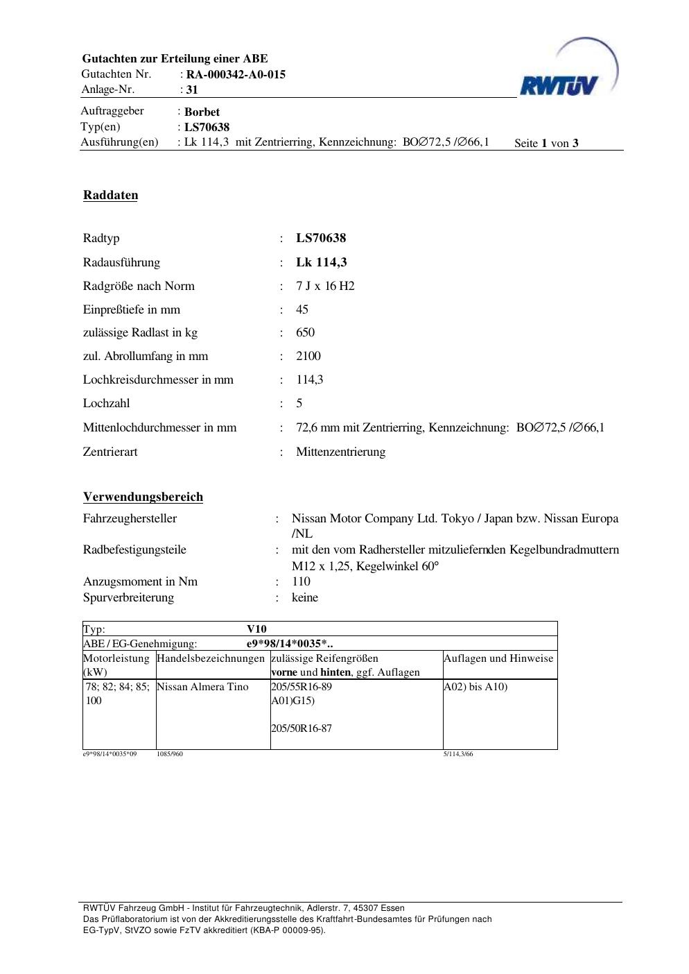 teilegutachten zur Borbet LS70638