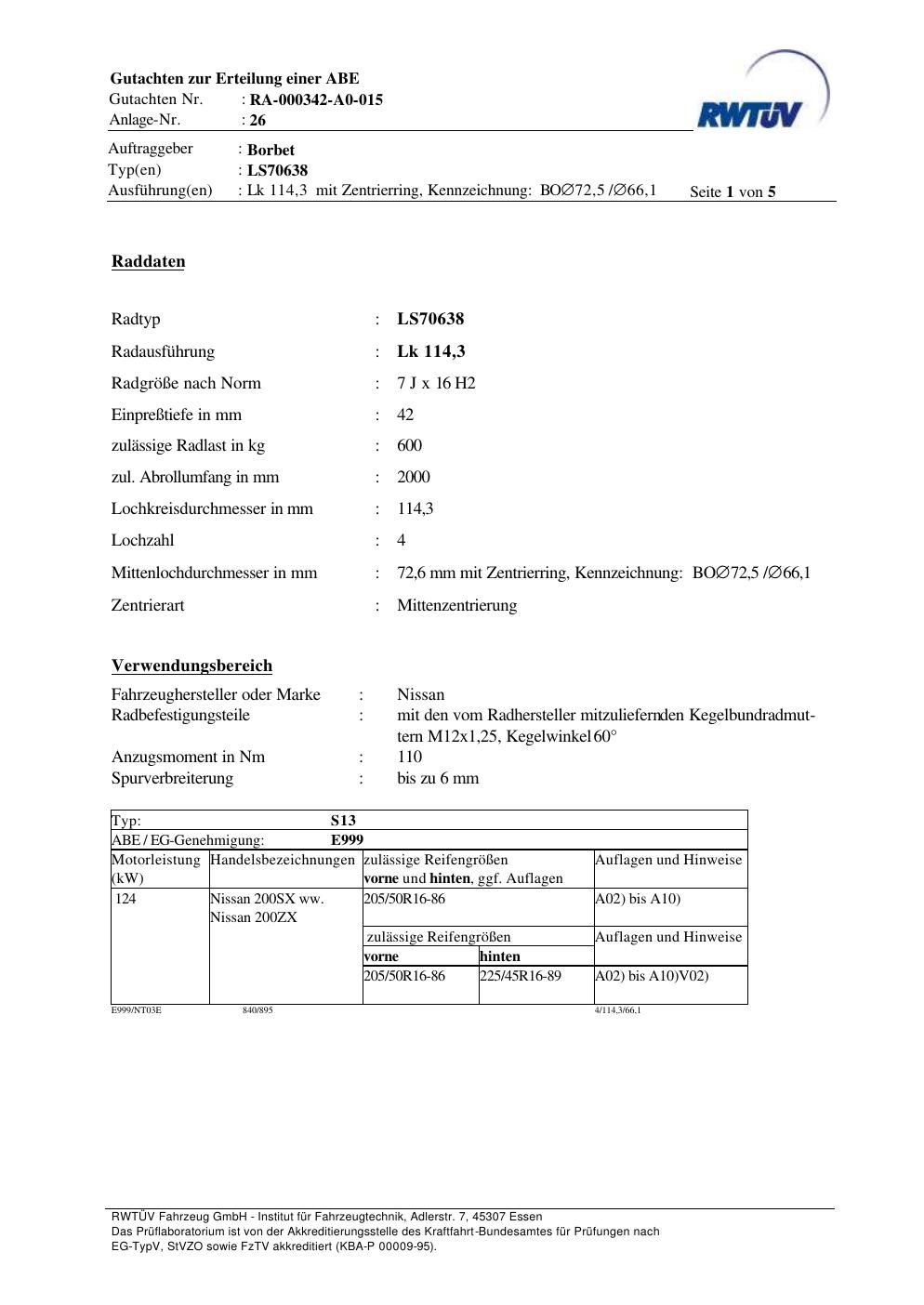 teilegutachten zur Borbet LS70638