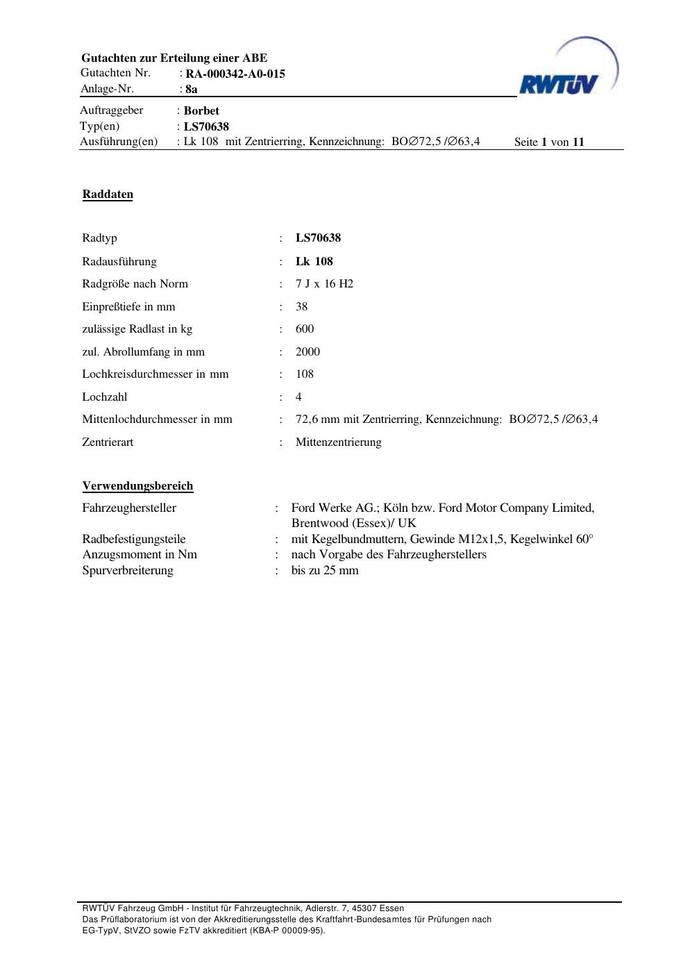 teilegutachten zur Borbet LS70638