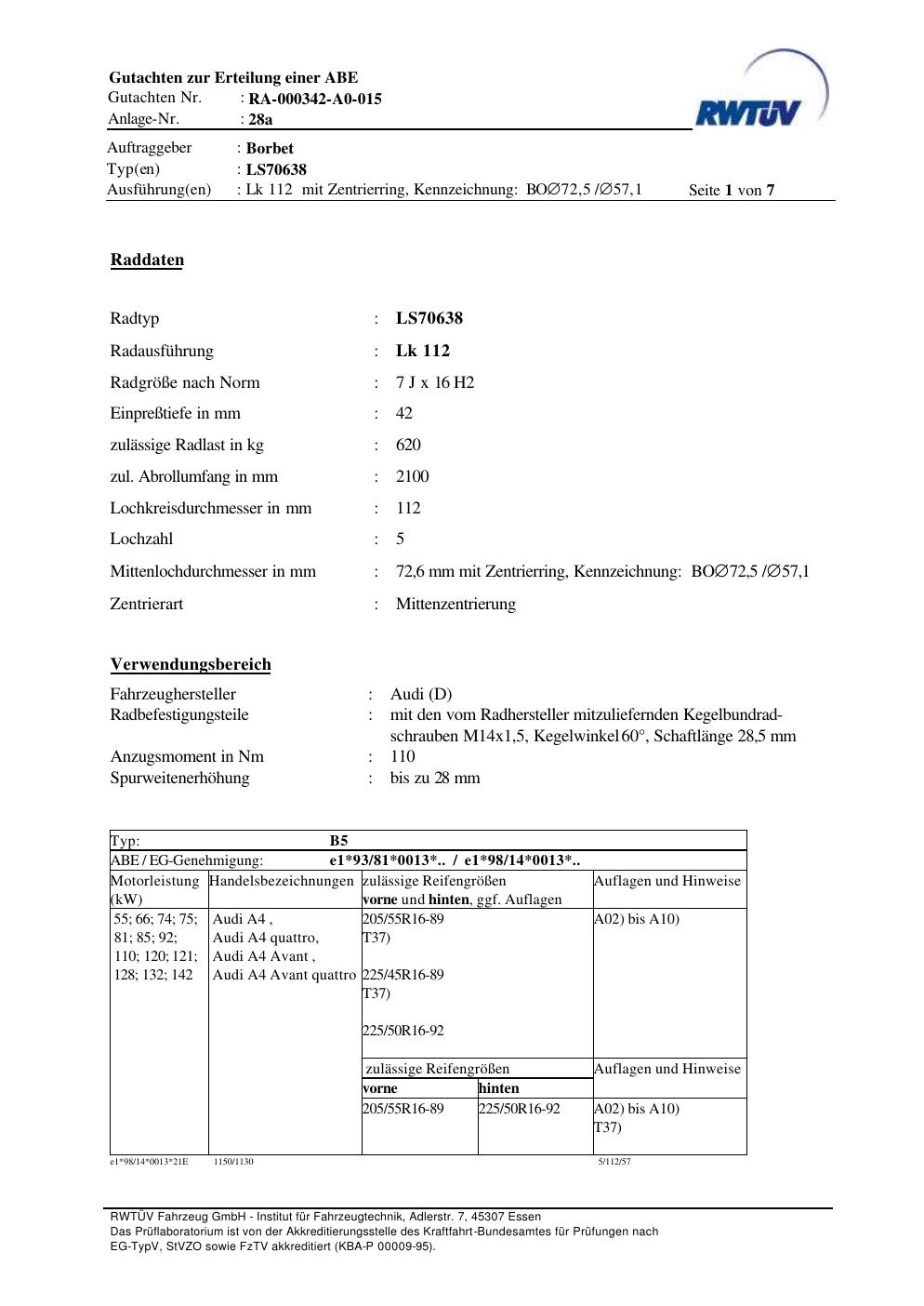 teilegutachten zur Borbet LS70638