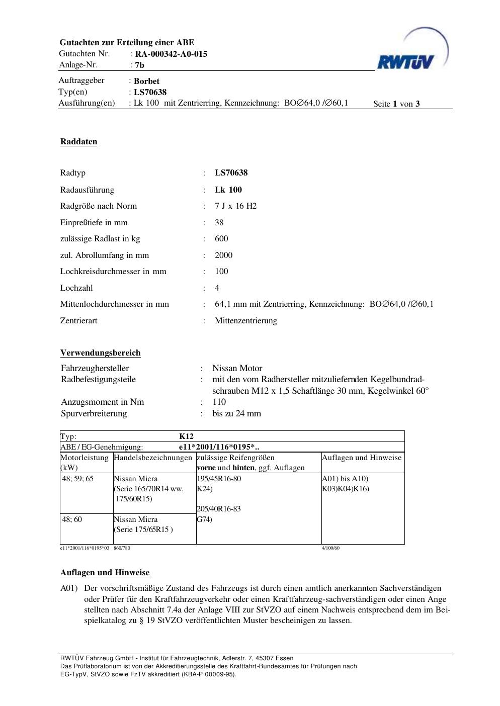 teilegutachten zur Borbet LS70638