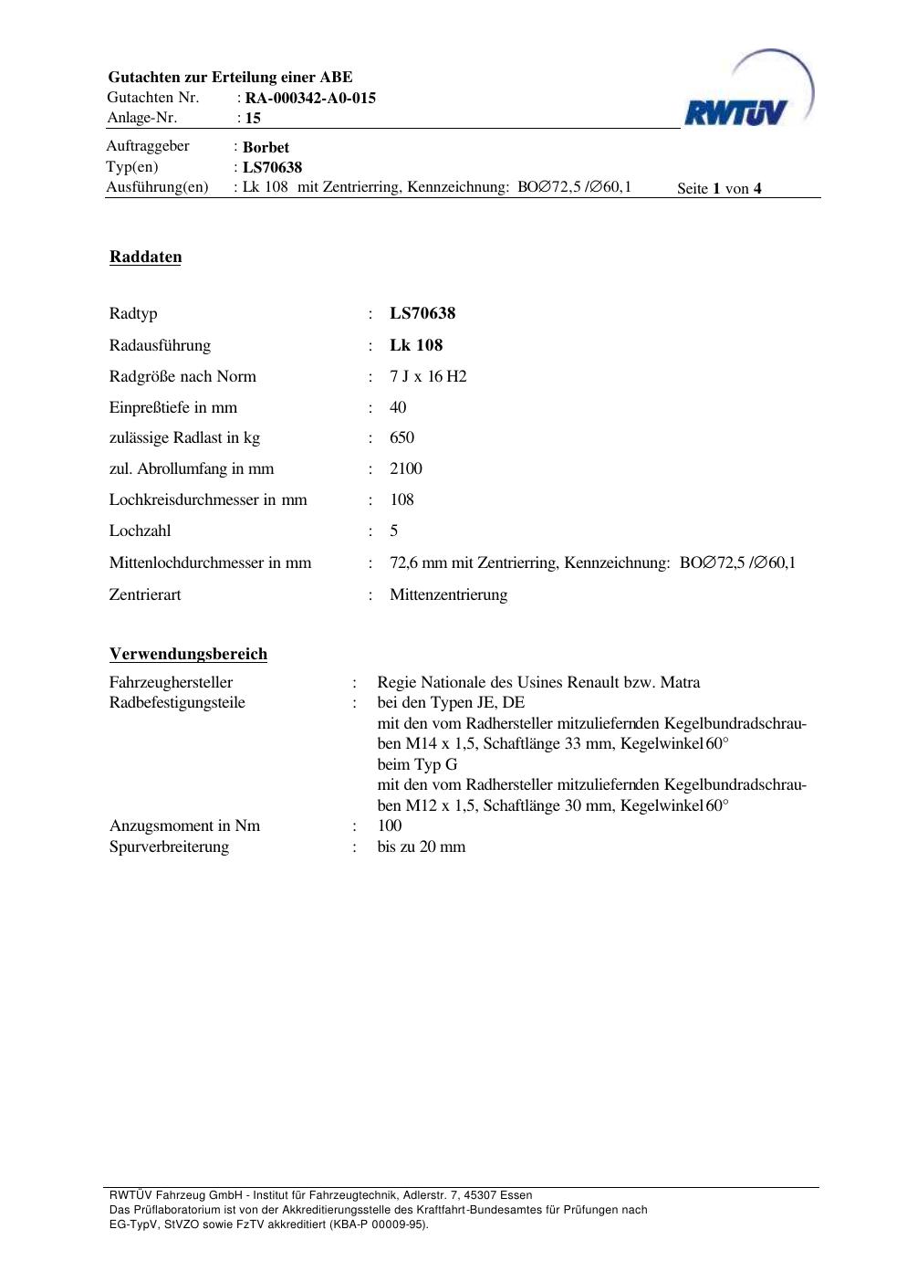 teilegutachten zur Borbet LS70638