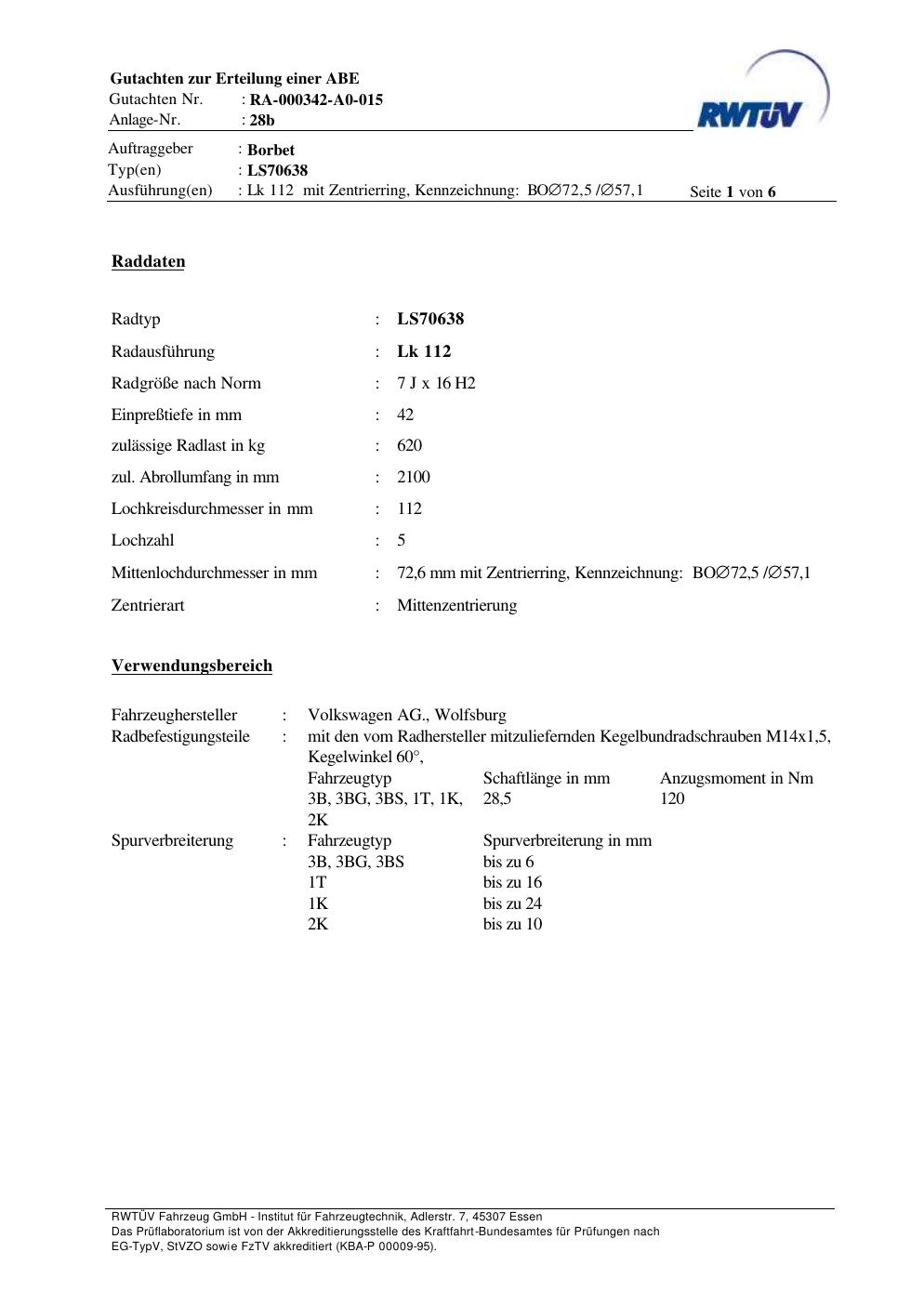 teilegutachten zur Borbet LS70638
