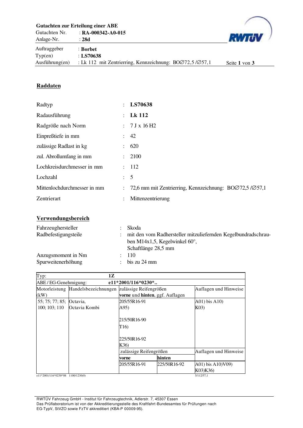teilegutachten zur Borbet LS70638