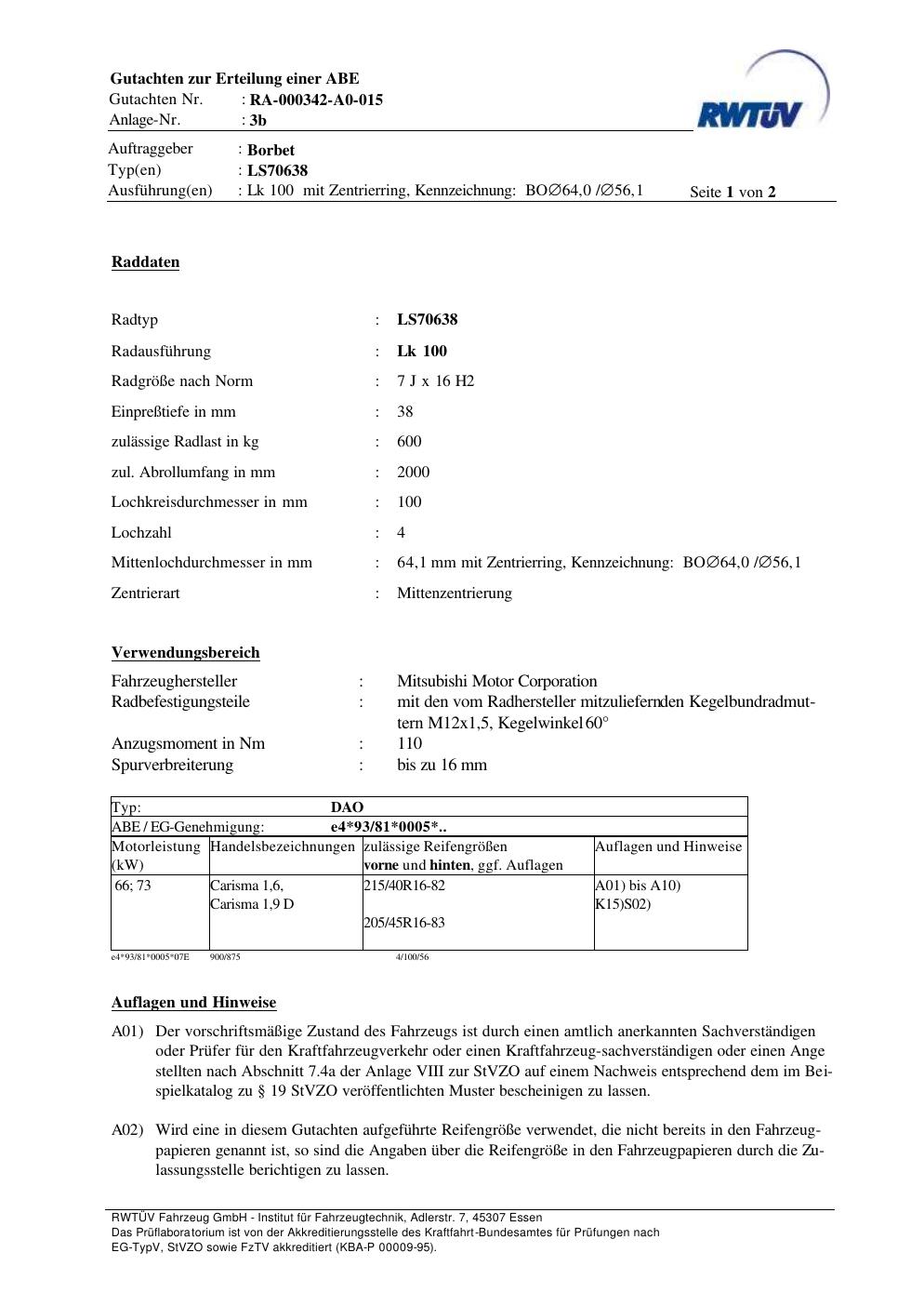 teilegutachten zur Borbet LS70638