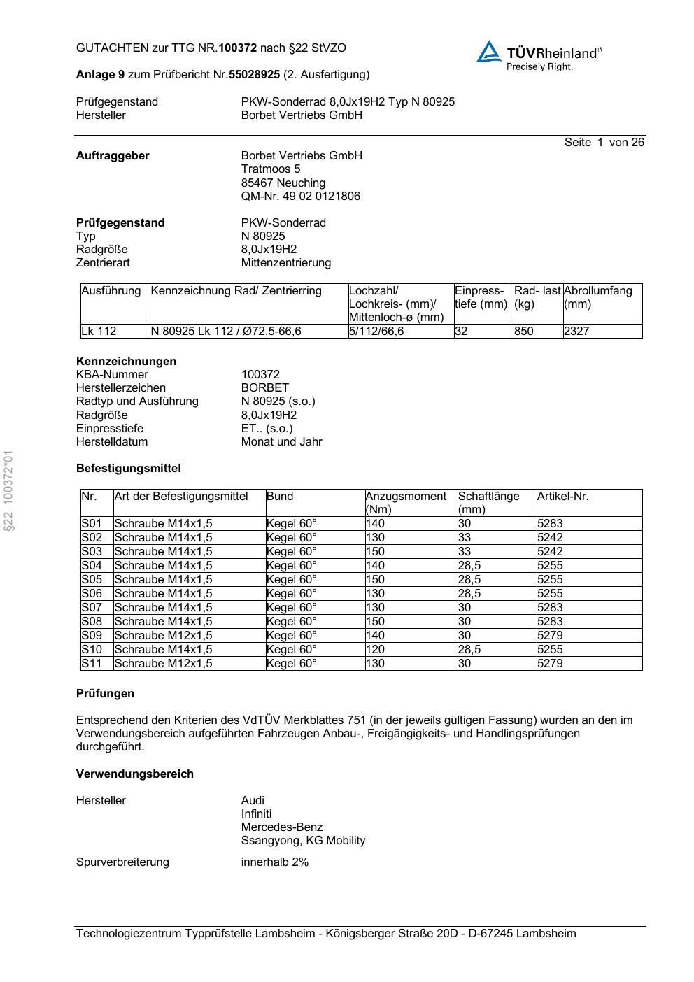 teilegutachten zur Borbet N 80925