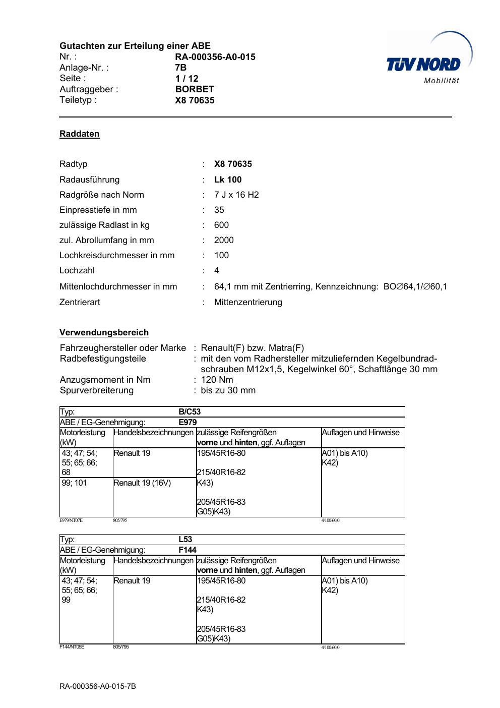 Dieses Gutachten (teilegutachten) bezieht sich auf die Alufelge Borbet X8 70635 in der Ausführung 7Jx16 ET 0, Mittenloch 0 mm . Im PDF findest du typischerweise zulässige Reifengrößen, Auflagen/Anbauhinweise und – je nach Dokument – Hinweise zur Eintragung.