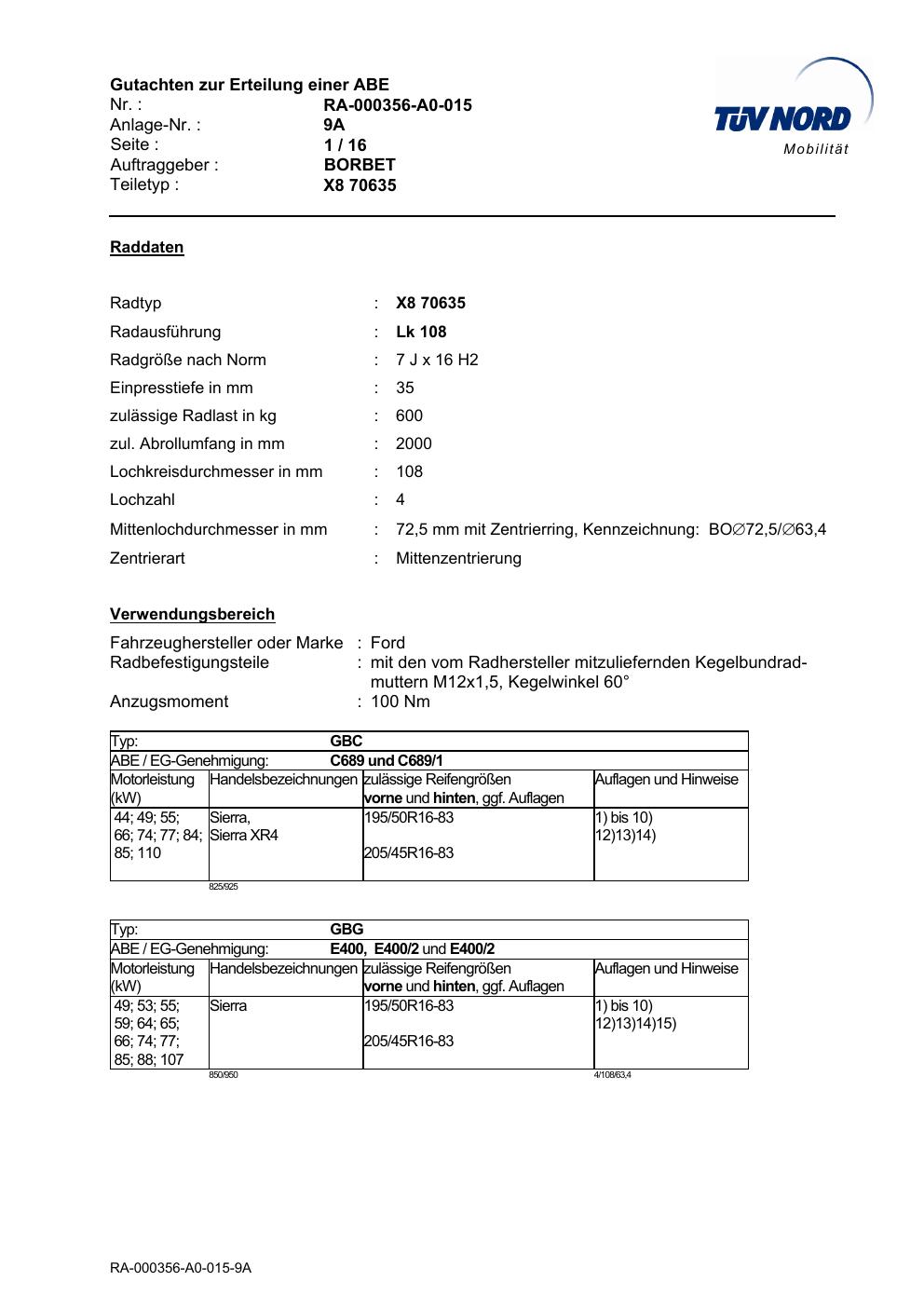 Dieses Gutachten (teilegutachten) bezieht sich auf die Alufelge Borbet X8 70635 in der Ausführung 7Jx16 ET 0, Mittenloch 0 mm . Im PDF findest du typischerweise zulässige Reifengrößen, Auflagen/Anbauhinweise und – je nach Dokument – Hinweise zur Eintragung.