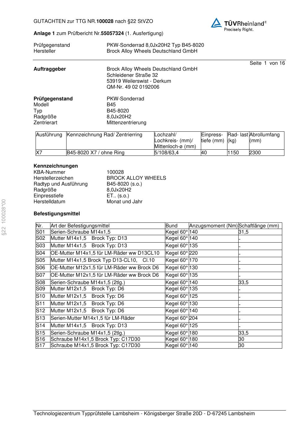 Felgengutachten / teilegutachten für Alufelgen Brock B45-8020 (8Jx2 ET 0, Mittenloch 0 mm) (Zertifikatsnummer zur). Hier kostenlos als PDF herunterladen. Der Download-Link ist 24 Stunden gültig und kann bis zu zwei Mal verwendet werden.