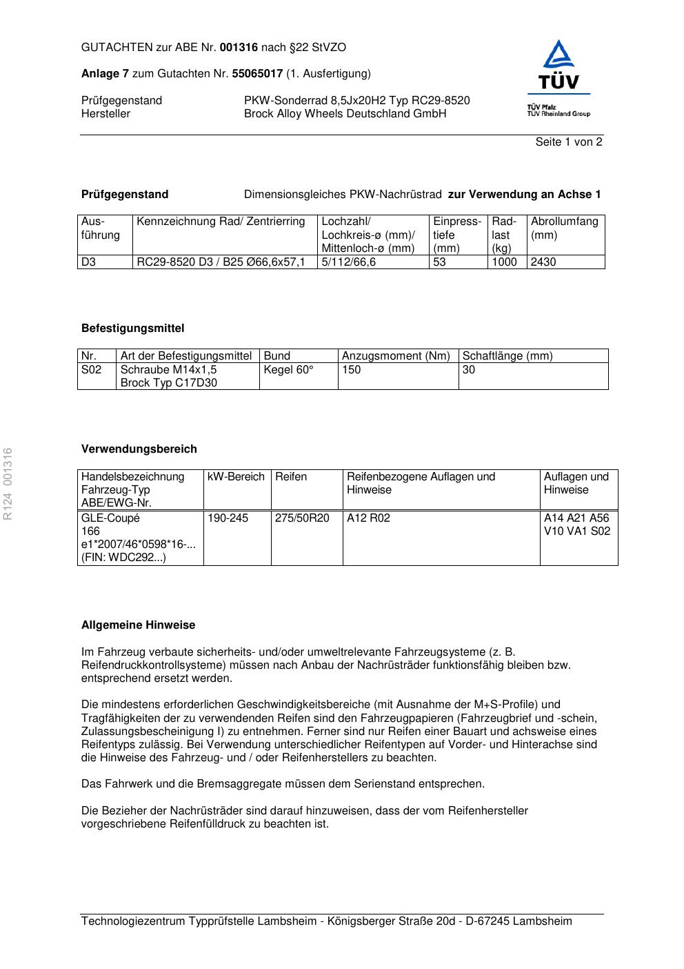 teilegutachten zur Brock RC29-852 0