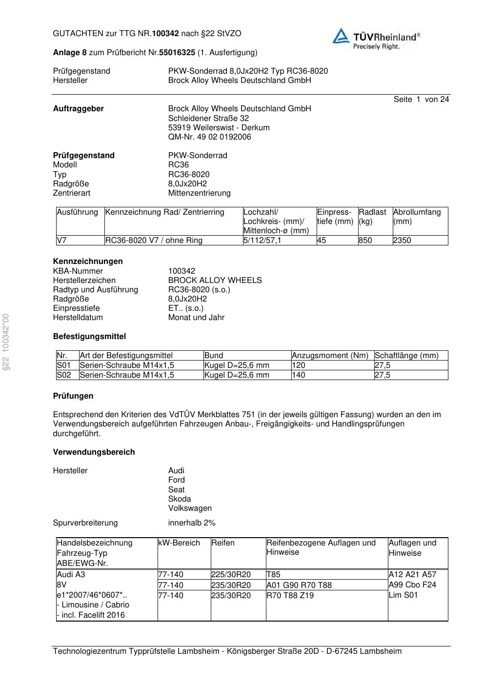 Felgengutachten / teilegutachten für Alufelgen Brock RC36-8020 (8Jx2 ET 0, Mittenloch 0 mm) (Zertifikatsnummer zur). Hier kostenlos als PDF herunterladen. Der Download-Link ist 24 Stunden gültig und kann bis zu zwei Mal verwendet werden.