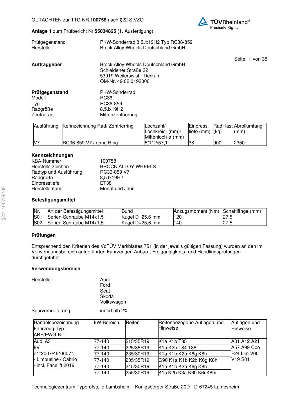 Felgengutachten / teilegutachten für Alufelgen Brock RC36-859 (8.5Jx19 ET 0, Mittenloch 0 mm) (Zertifikatsnummer zur). Hier kostenlos als PDF herunterladen. Der Download-Link ist 24 Stunden gültig und kann bis zu zwei Mal verwendet werden.