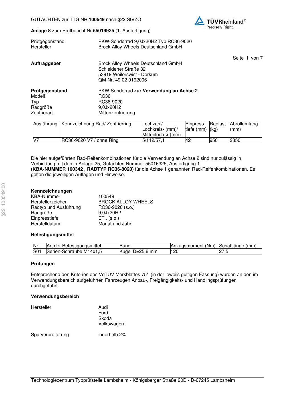 teilegutachten zur Brock RC36-9020