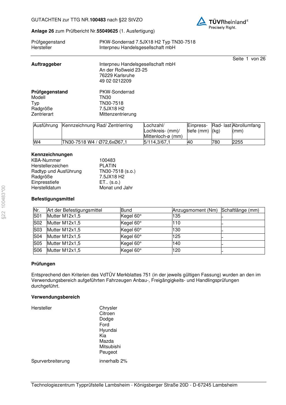 Dieses teilegutachten gehört zur Felge Platin TN30-75 18 in 7.5Jx18 ET0 . Die Seite ist dafür gedacht, dass du schnell prüfen kannst, ob KBA, Design und Größe zu deiner Felge passen und danach direkt das richtige PDF lädst.