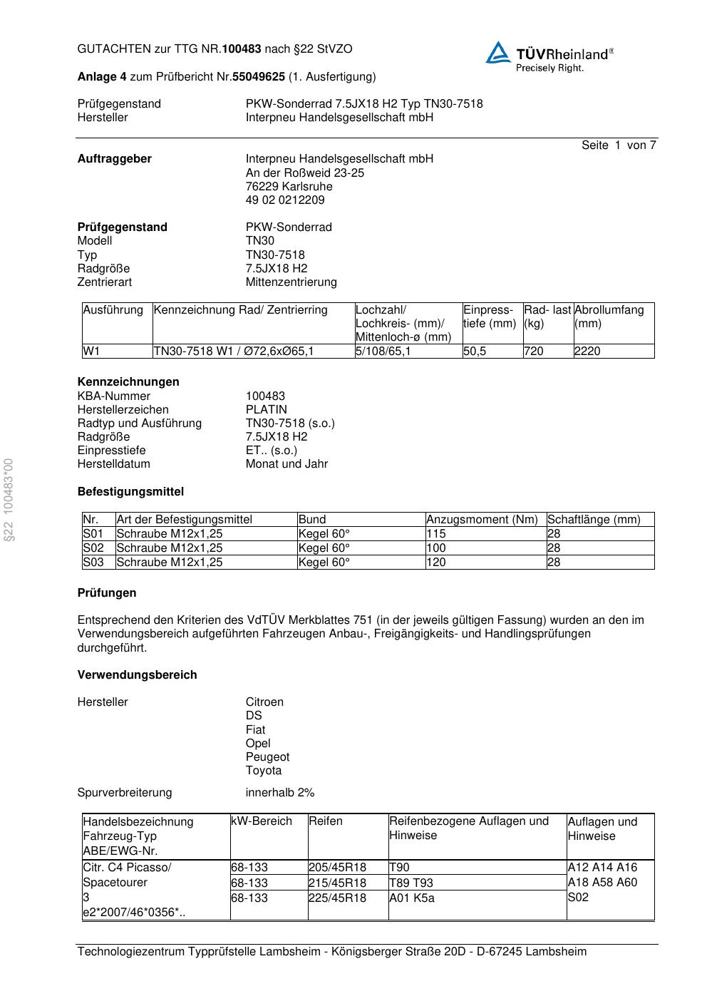 teilegutachten zur Platin TN30-75 18