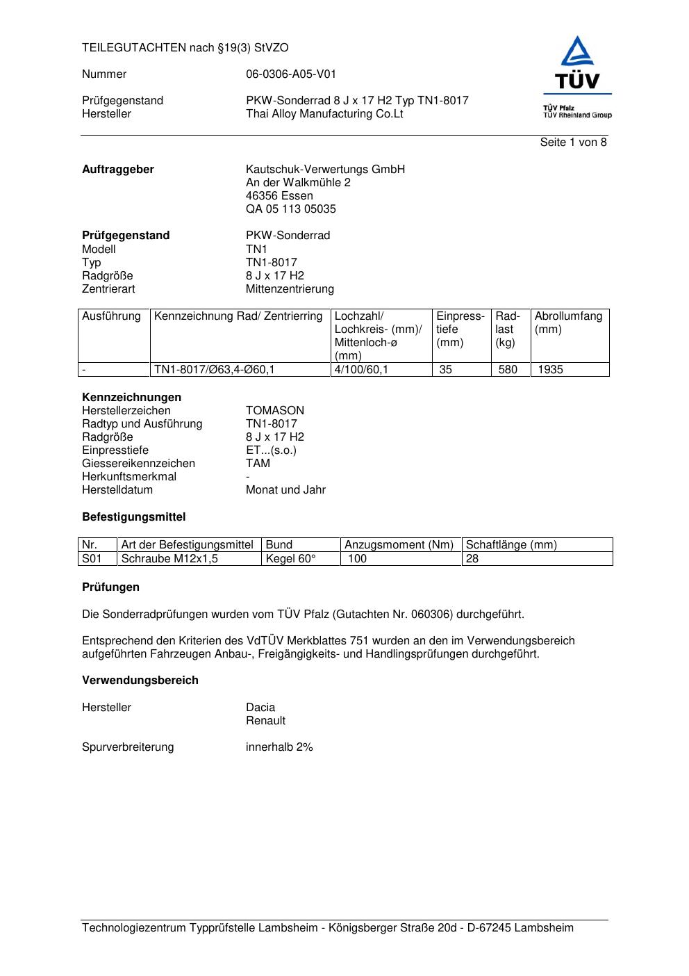 teilegutachten 06-0306-a05-v01 Thai Alloy Manufacturing Co.Lt TN1-8017