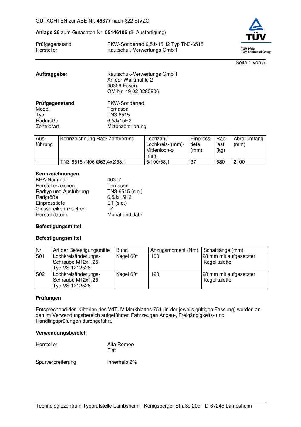 Felgengutachten / abe für Alufelgen TOMASON TN3-6515 (ET 0, Mittenloch 0 mm) mit KBA 46377 (Zertifikatsnummer 46377). Hier kostenlos als PDF herunterladen. Der Download-Link ist 24 Stunden gültig und kann bis zu zwei Mal verwendet werden.