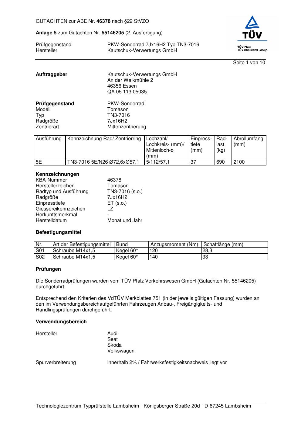 Felgengutachten / abe für Alufelgen TOMASON TN3-7016 (ET 0, Mittenloch 0 mm) mit KBA 46378 (Zertifikatsnummer 46378). Hier kostenlos als PDF herunterladen. Der Download-Link ist 24 Stunden gültig und kann bis zu zwei Mal verwendet werden.