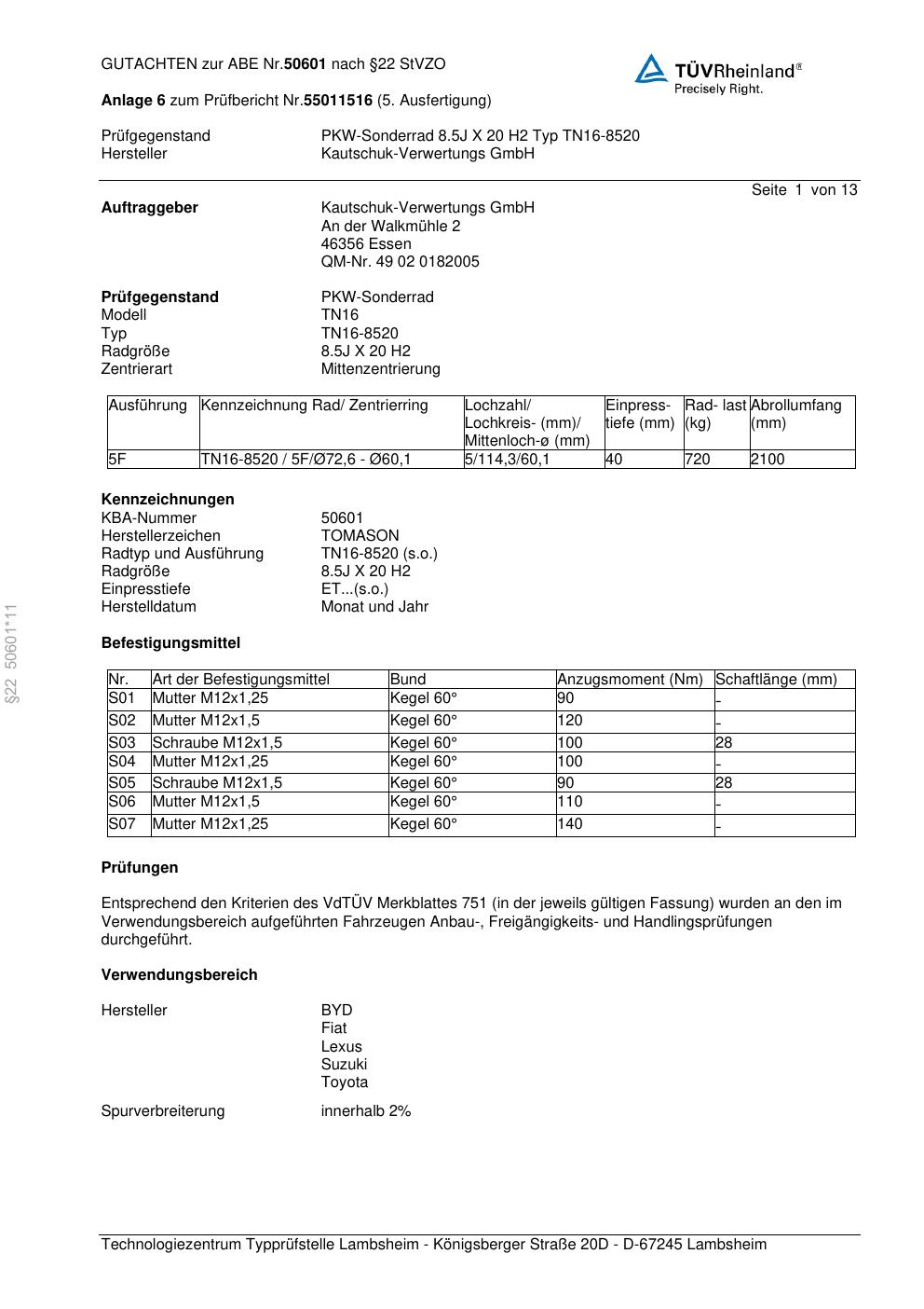 Dieses Gutachten (abe) bezieht sich auf die Alufelge TOMASON TN16-8520 in der Ausführung ET 0, Mittenloch 0 mm (KBA 50601). Im PDF findest du typischerweise zulässige Reifengrößen, Auflagen/Anbauhinweise und – je nach Dokument – Hinweise zur Eintragung.