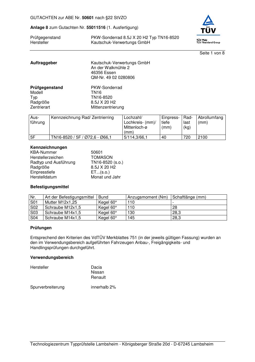 Dieses Gutachten (abe) bezieht sich auf die Alufelge TOMASON TN16- 8520 in der Ausführung ET 0, Mittenloch 0 mm (KBA 50601). Im PDF findest du typischerweise zulässige Reifengrößen, Auflagen/Anbauhinweise und – je nach Dokument – Hinweise zur Eintragung.