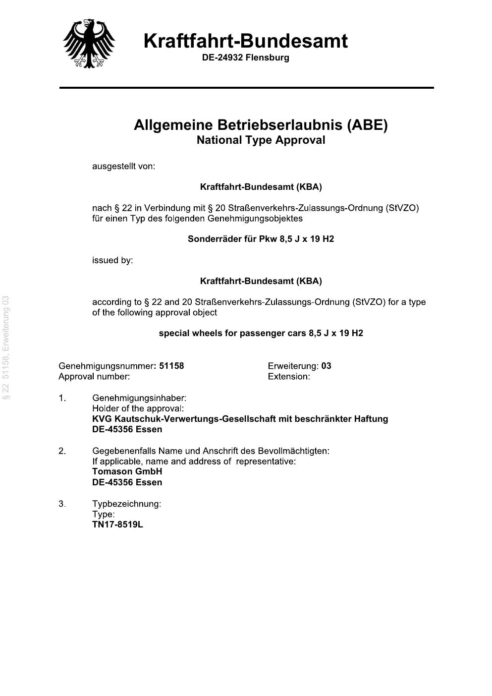 - Kautschuk-Verwertungs GmbH (Herstellerzeichen TOMASON) TN17-8519L – 0.0Jx0 ET0.0 (KBA 51158)