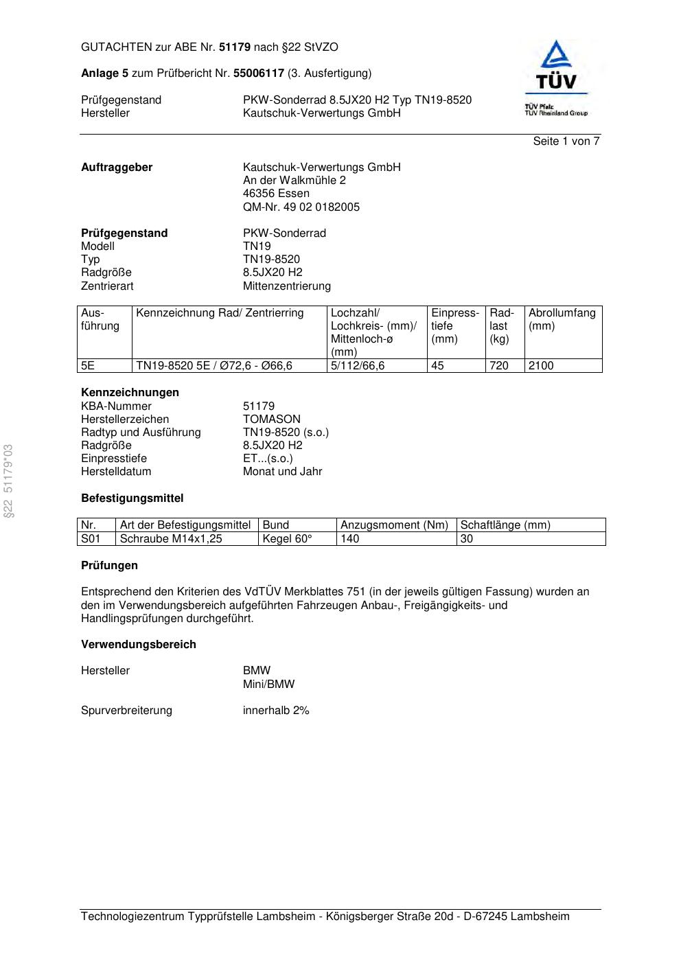 Dieses Gutachten (abe) bezieht sich auf die Alufelge TOMASON TN19-8520 in der Ausführung ET 0, Mittenloch 0 mm (KBA 51179). Im PDF findest du typischerweise zulässige Reifengrößen, Auflagen/Anbauhinweise und – je nach Dokument – Hinweise zur Eintragung.
