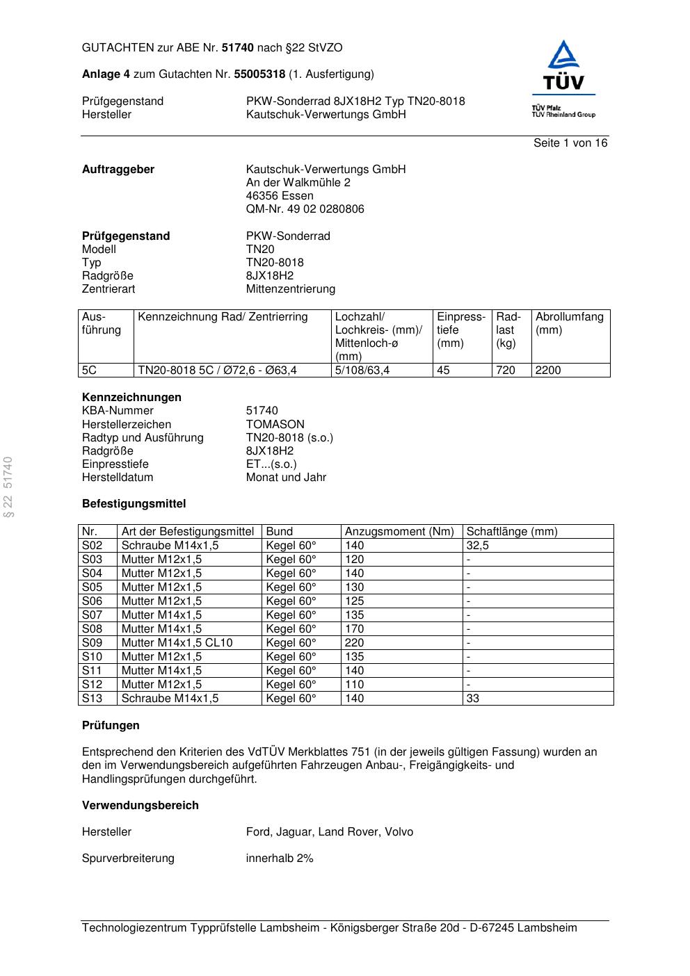 Felgengutachten / abe für Alufelgen TOMASON (Kautschuk-Verwertungs GmbH) TN20-8018 (ET 0, Mittenloch 0 mm) mit KBA 51740 (Zertifikatsnummer 51740). Hier kostenlos als PDF herunterladen. Der Download-Link ist 24 Stunden gültig und kann bis zu zwei Mal verwendet werden.