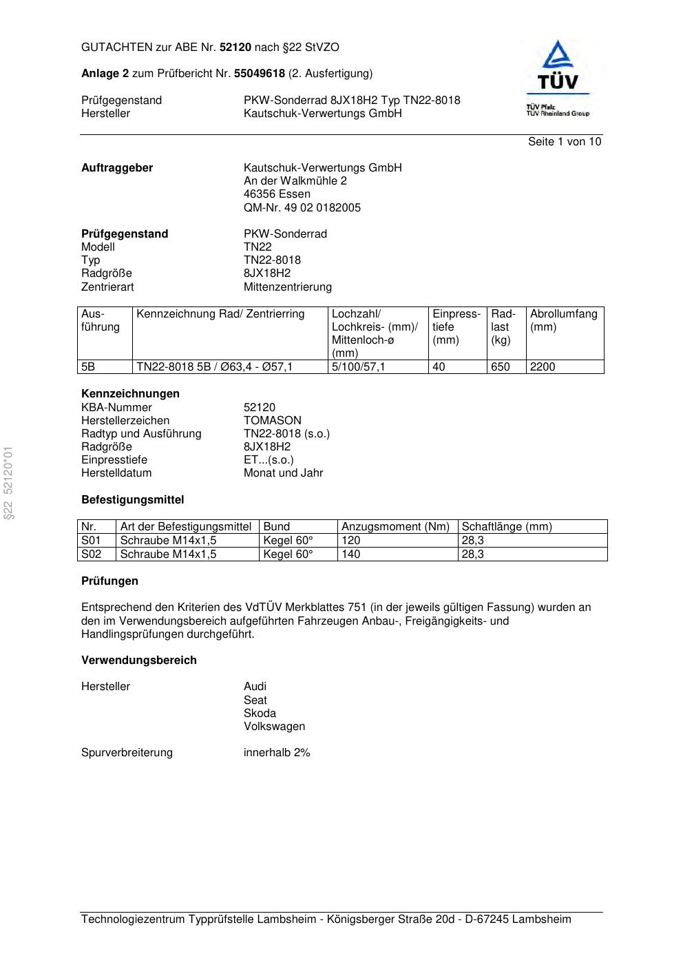 Dieses Gutachten (abe) bezieht sich auf die Alufelge TOMASON TN22-8018 in der Ausführung ET 0, Mittenloch 0 mm (KBA 52120). Im PDF findest du typischerweise zulässige Reifengrößen, Auflagen/Anbauhinweise und – je nach Dokument – Hinweise zur Eintragung.