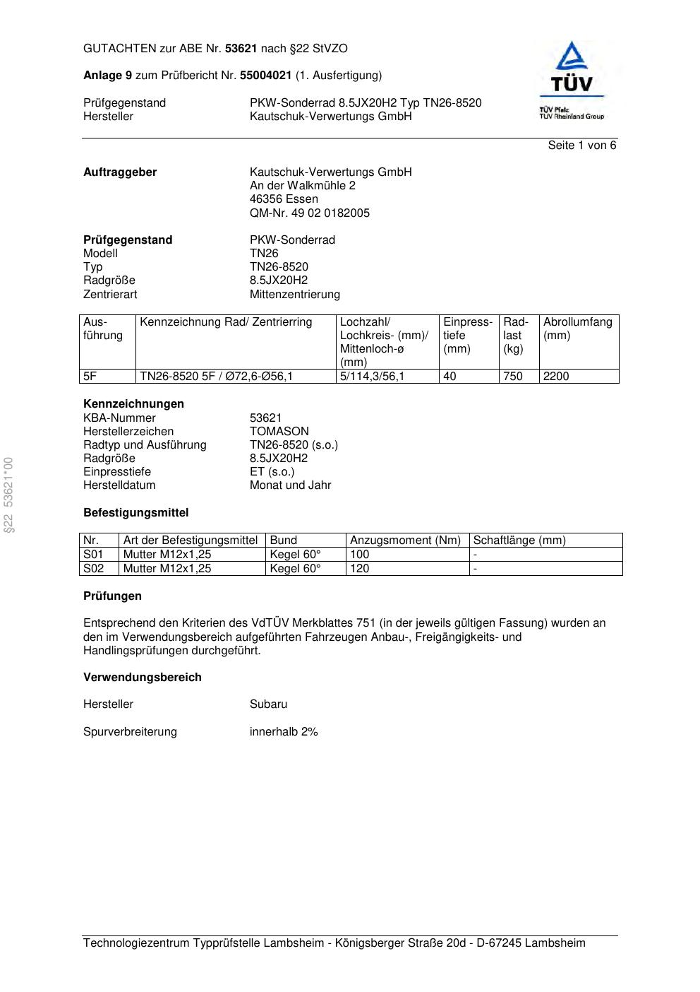 Dieses Gutachten (abe) bezieht sich auf die Alufelge TOMASON TN26-8520 in der Ausführung ET 0, Mittenloch 0 mm (KBA 53621). Im PDF findest du typischerweise zulässige Reifengrößen, Auflagen/Anbauhinweise und – je nach Dokument – Hinweise zur Eintragung.