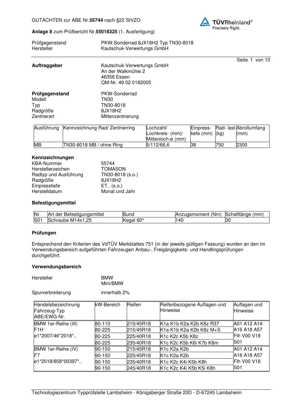 Felgengutachten / abe für Alufelgen TOMASON (Kautschuk-Verwertungs GmbH) TN30-8018 (ET 0, Mittenloch 0 mm) mit KBA 55744 (Zertifikatsnummer 55744). Hier kostenlos als PDF herunterladen. Der Download-Link ist 24 Stunden gültig und kann bis zu zwei Mal verwendet werden.