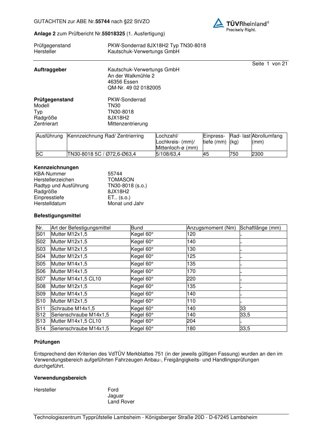 Dieses Gutachten (abe) bezieht sich auf die Alufelge TOMASON TN30-8018 in der Ausführung ET 0, Mittenloch 0 mm (KBA 55744). Im PDF findest du typischerweise zulässige Reifengrößen, Auflagen/Anbauhinweise und – je nach Dokument – Hinweise zur Eintragung.
