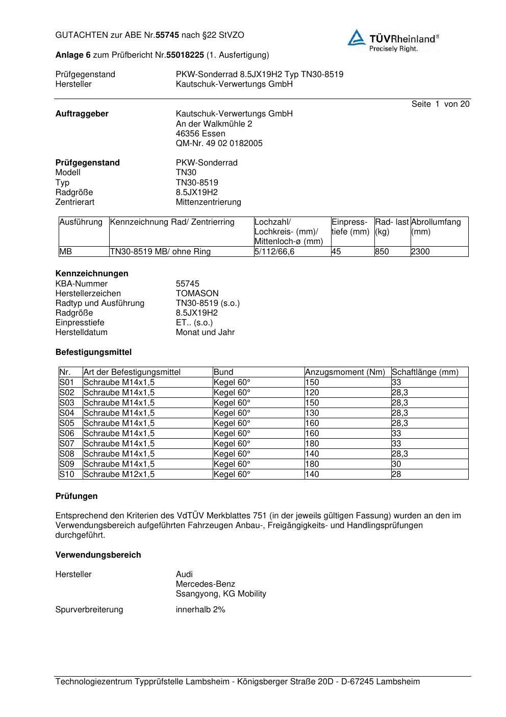 Felgengutachten / abe für Alufelgen TOMASON (Kautschuk-Verwertungs GmbH) TN30-8519 (ET 0, Mittenloch 0 mm) mit KBA 55745 (Zertifikatsnummer 55745). Hier kostenlos als PDF herunterladen. Der Download-Link ist 24 Stunden gültig und kann bis zu zwei Mal verwendet werden.