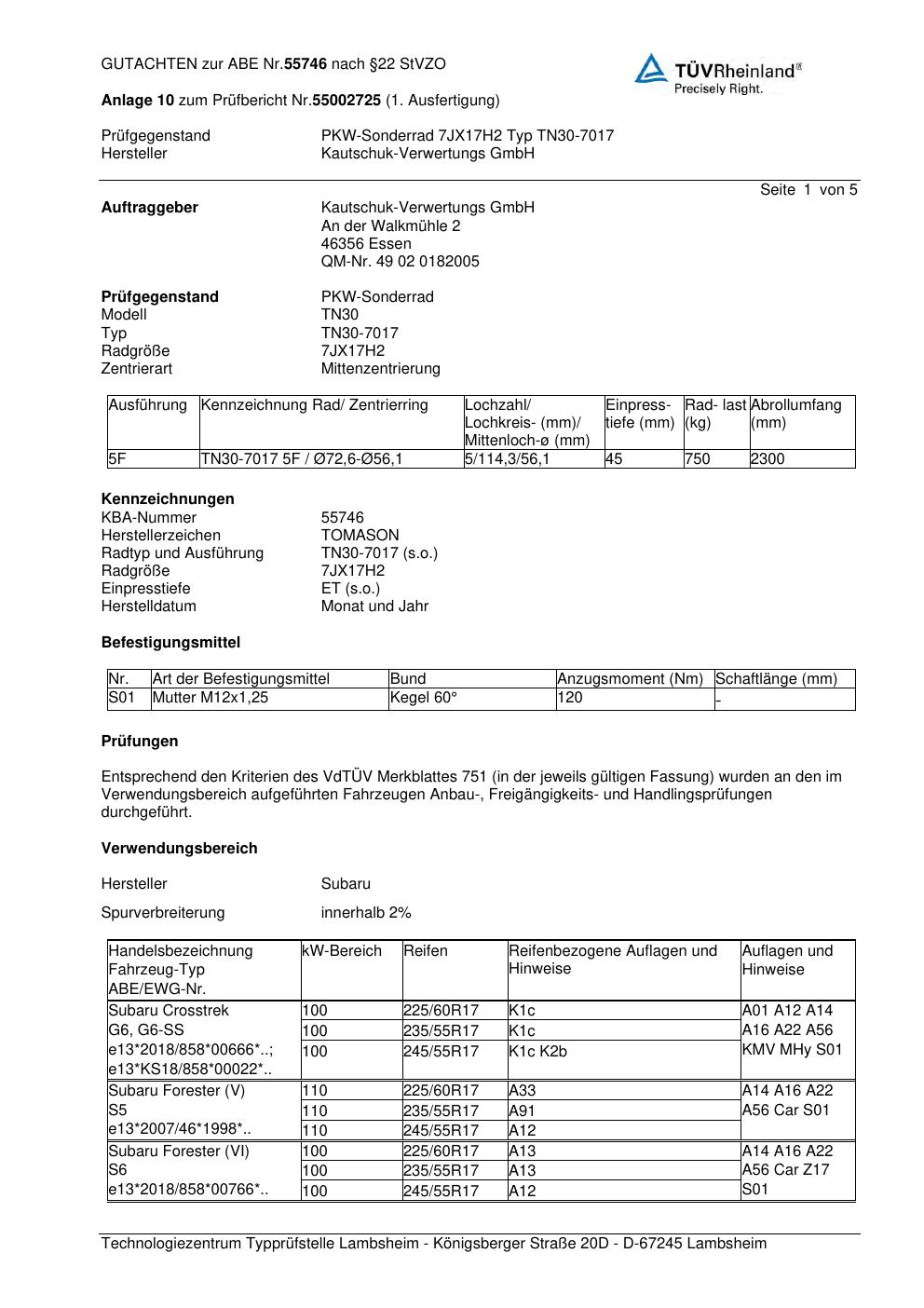Dieses Gutachten (abe) bezieht sich auf die Alufelge TOMASON TN30-7017 in der Ausführung ET 0, Mittenloch 0 mm (KBA 55746). Im PDF findest du typischerweise zulässige Reifengrößen, Auflagen/Anbauhinweise und – je nach Dokument – Hinweise zur Eintragung.