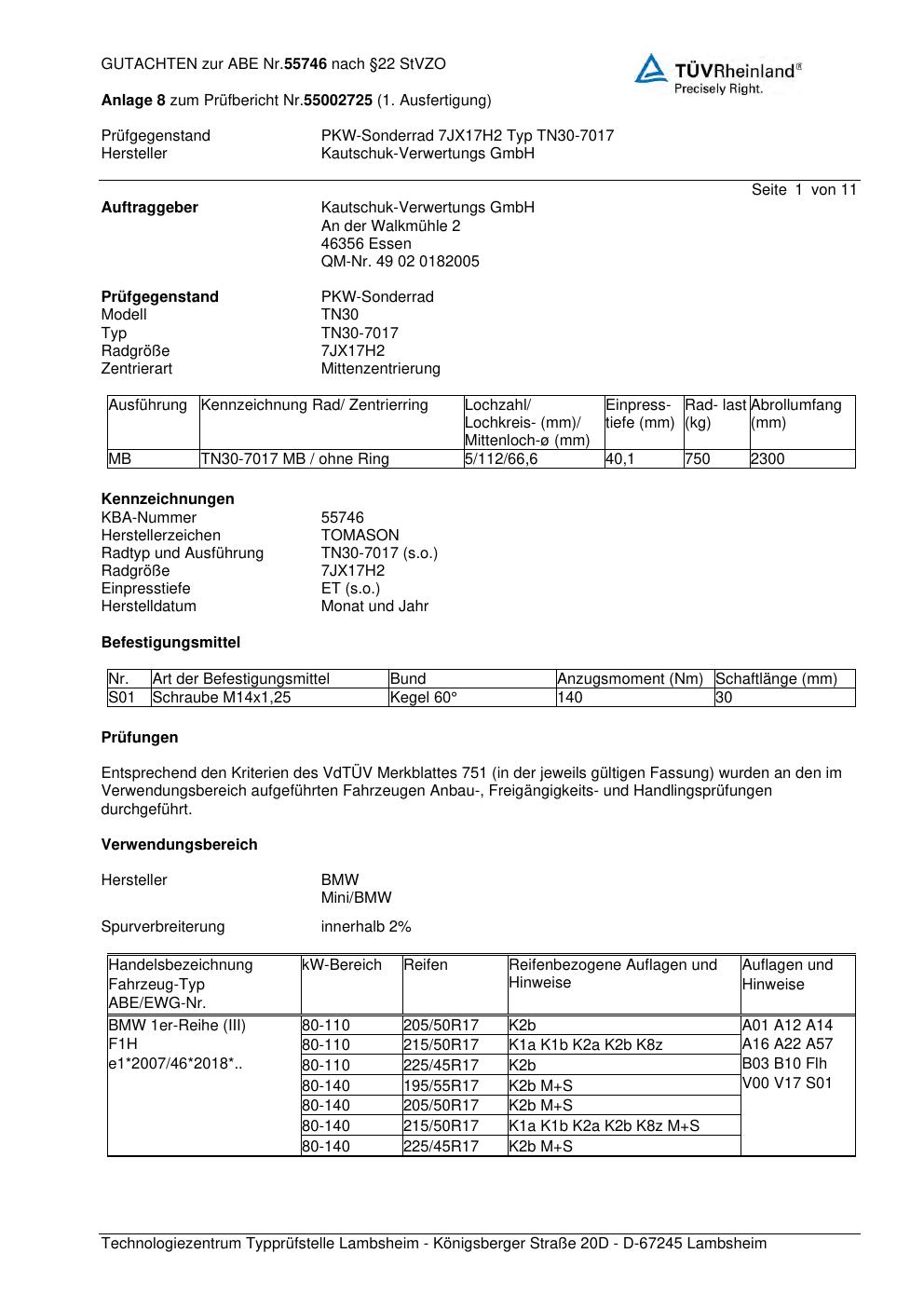 Dieses Gutachten (abe) bezieht sich auf die Alufelge TOMASON TN30-7017 in der Ausführung ET 0, Mittenloch 0 mm (KBA 55746). Im PDF findest du typischerweise zulässige Reifengrößen, Auflagen/Anbauhinweise und – je nach Dokument – Hinweise zur Eintragung.