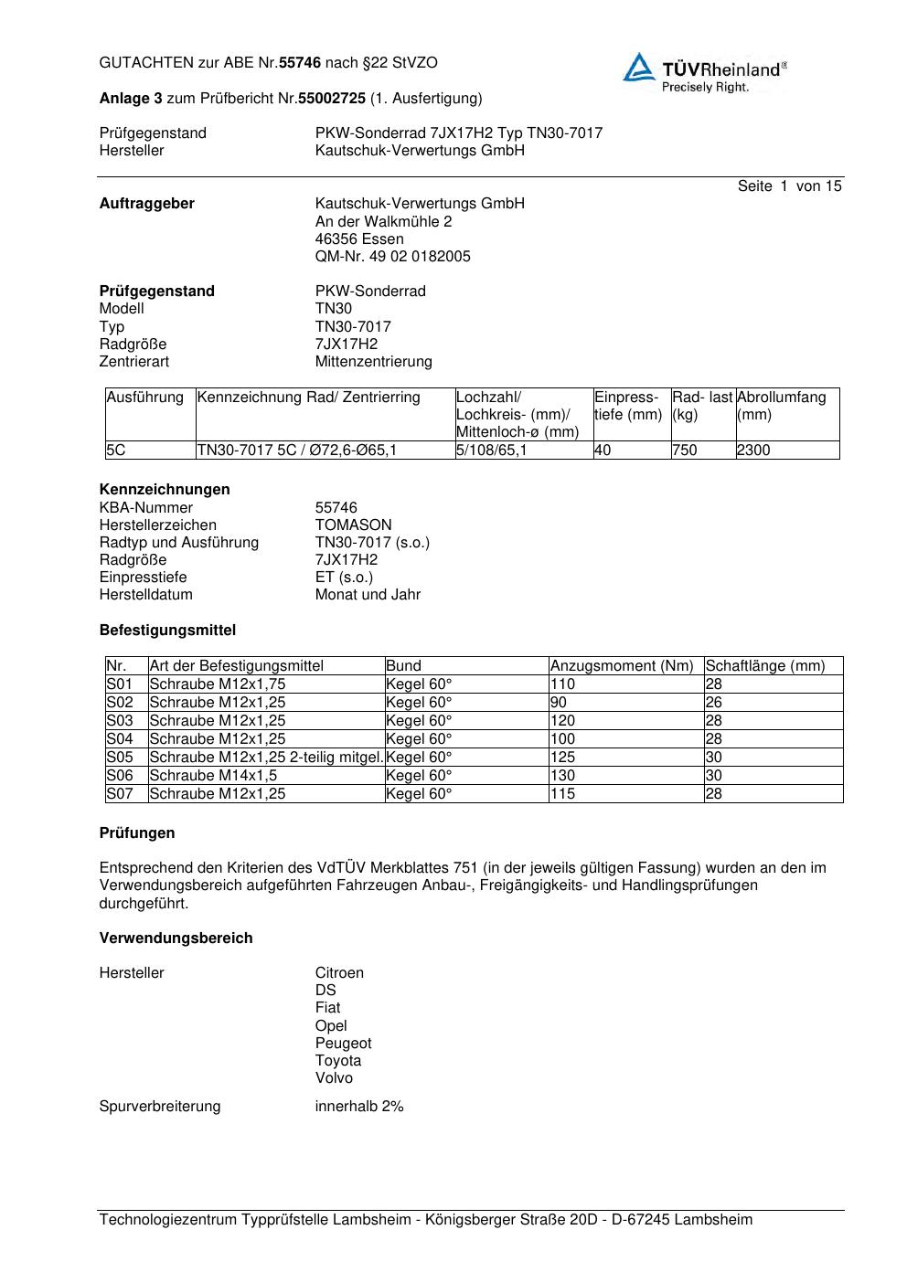 Felgengutachten / abe für Alufelgen Tomason (Hersteller: Kautschuk-Verwertungs GmbH) TN30-7017 (ET 0, Mittenloch 0 mm) mit KBA 55746 (Zertifikatsnummer 55746). Hier kostenlos als PDF herunterladen. Der Download-Link ist 24 Stunden gültig und kann bis zu zwei Mal verwendet werden.