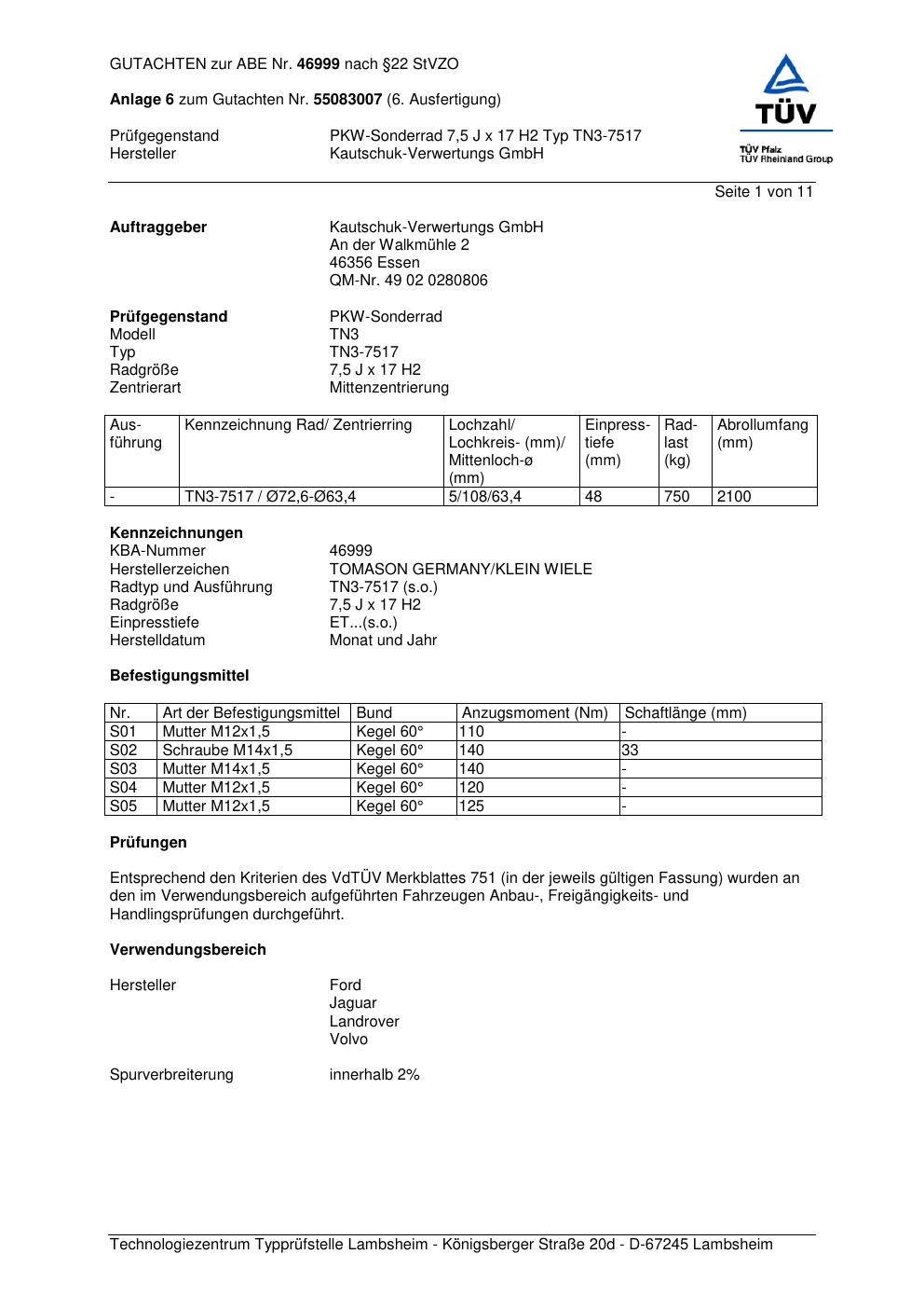 Dieses Gutachten (abe) bezieht sich auf die Alufelge TOMASON GERMANY / KLEIN WIELE TN3-7517 in der Ausführung ET 0, Mittenloch 0 mm (KBA 46999). Im PDF findest du typischerweise zulässige Reifengrößen, Auflagen/Anbauhinweise und – je nach Dokument – Hinweise zur Eintragung.