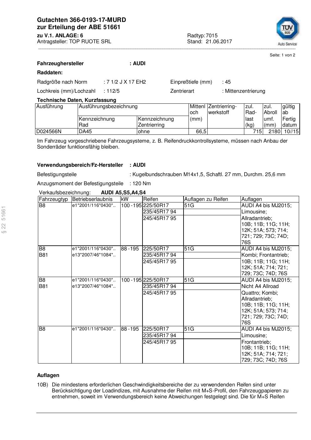 Dieses Gutachten (abe) bezieht sich auf die Alufelge TOP RUOTE SRL 7015 in der Ausführung ET 0, Mittenloch 0 mm (KBA 51661). Im PDF findest du typischerweise zulässige Reifengrößen, Auflagen/Anbauhinweise und – je nach Dokument – Hinweise zur Eintragung.