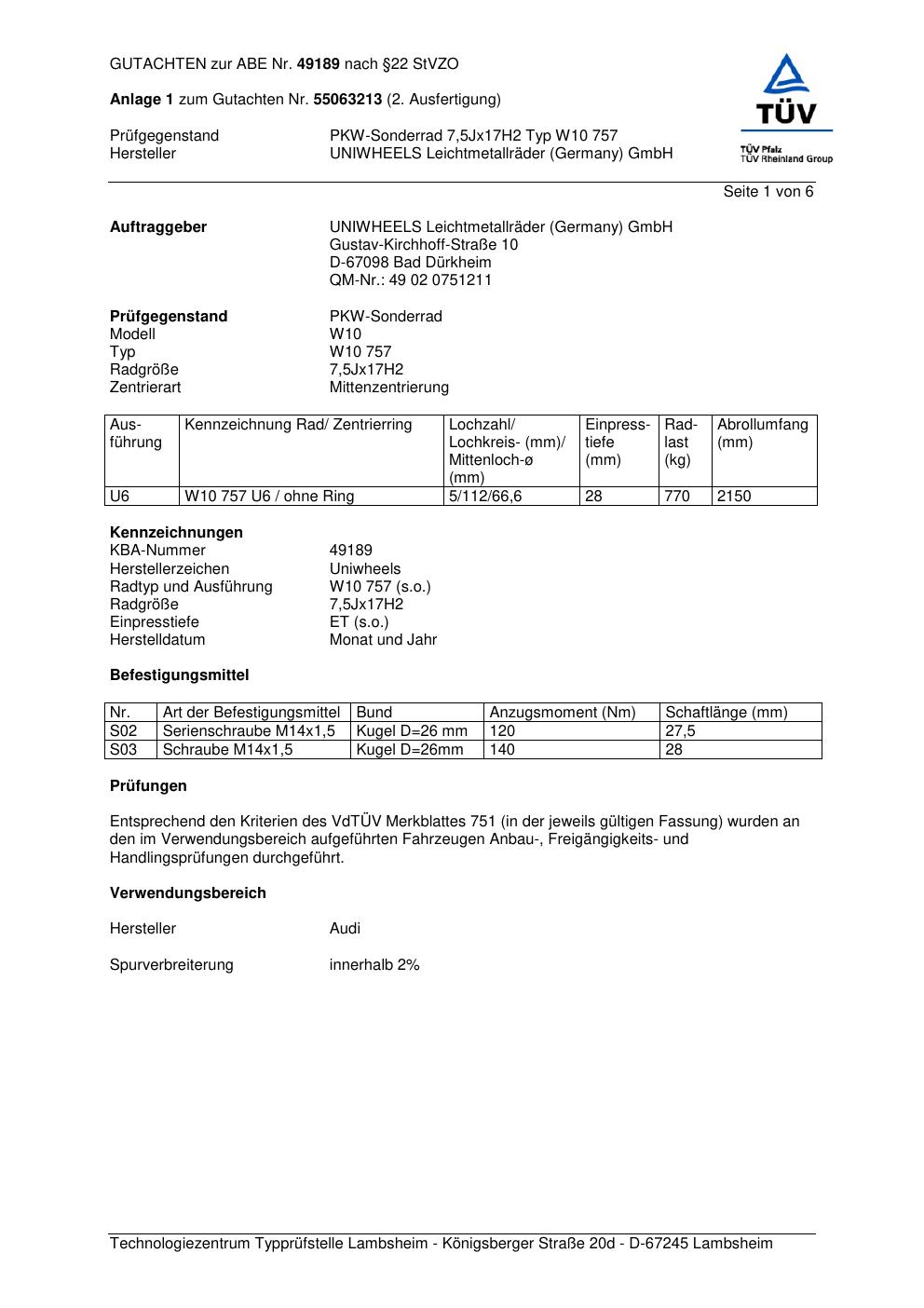 Dieses abe gehört zur Felge UNIWHEELS W10 757 in ET0 mit KBA 49189. Die Seite ist dafür gedacht, dass du schnell prüfen kannst, ob KBA, Design und Größe zu deiner Felge passen und danach direkt das richtige PDF lädst.