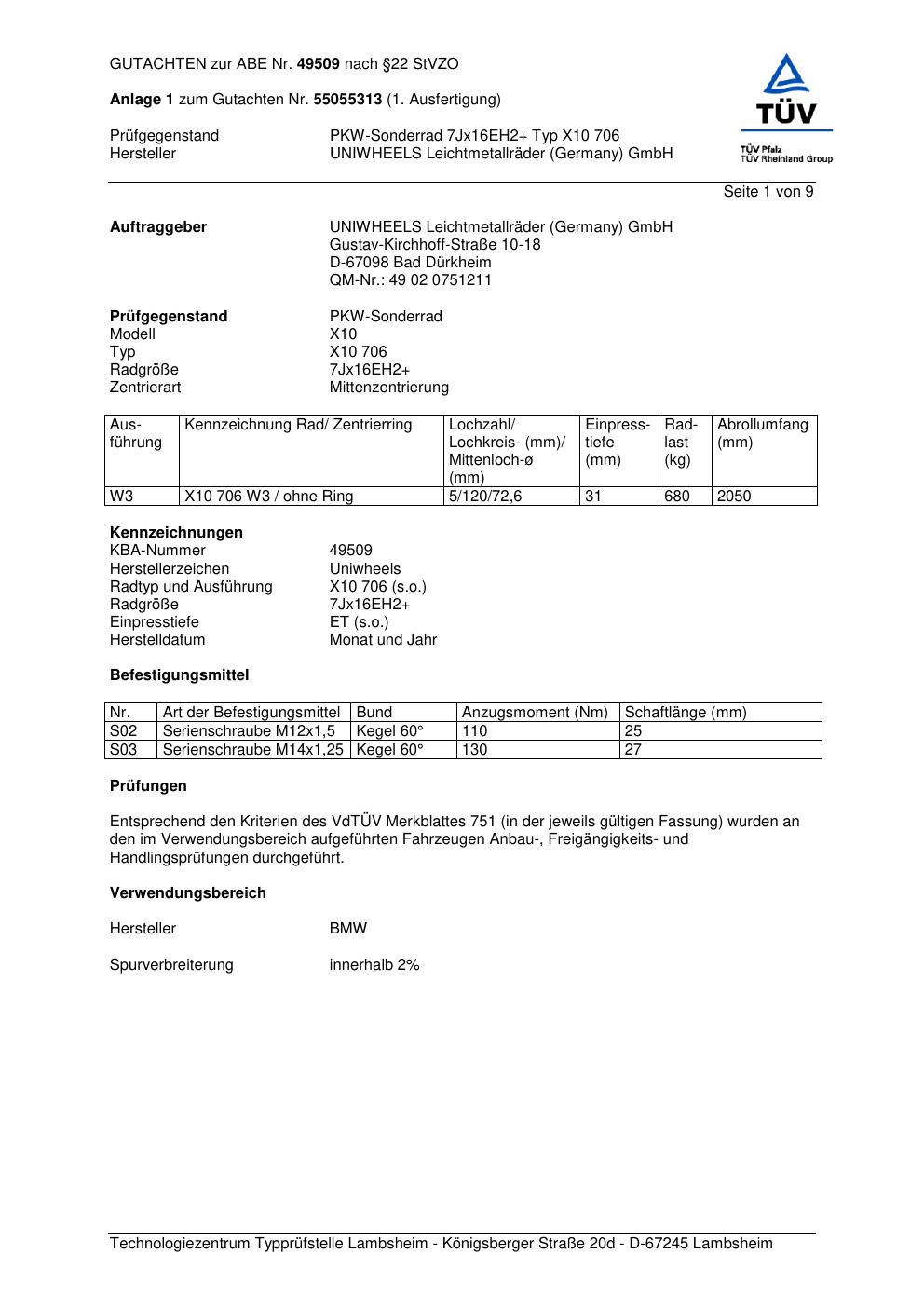 Dieses Gutachten (abe) bezieht sich auf die Alufelge UNIWHEELS X10 706 in der Ausführung ET 0, Mittenloch 0 mm (KBA 49509). Im PDF findest du typischerweise zulässige Reifengrößen, Auflagen/Anbauhinweise und – je nach Dokument – Hinweise zur Eintragung.