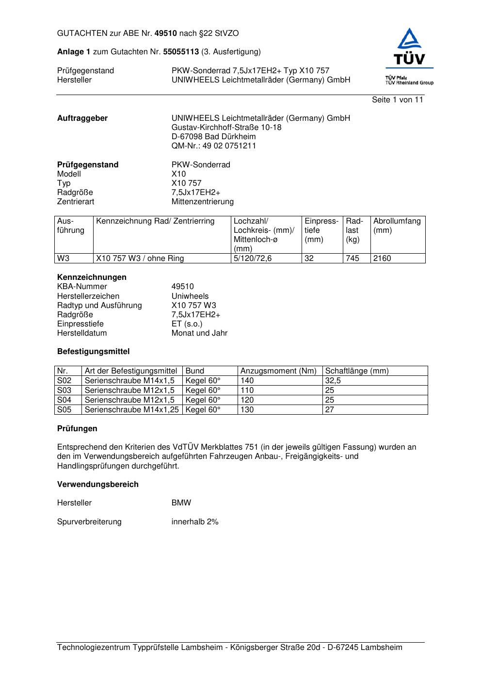 Felgengutachten / abe für Alufelgen UNIWHEELS Leichtmetallräder (Germany) GmbH X10 757 (ET 0, Mittenloch 0 mm) mit KBA 49510 (Zertifikatsnummer 49510). Hier kostenlos als PDF herunterladen. Der Download-Link ist 24 Stunden gültig und kann bis zu zwei Mal verwendet werden.