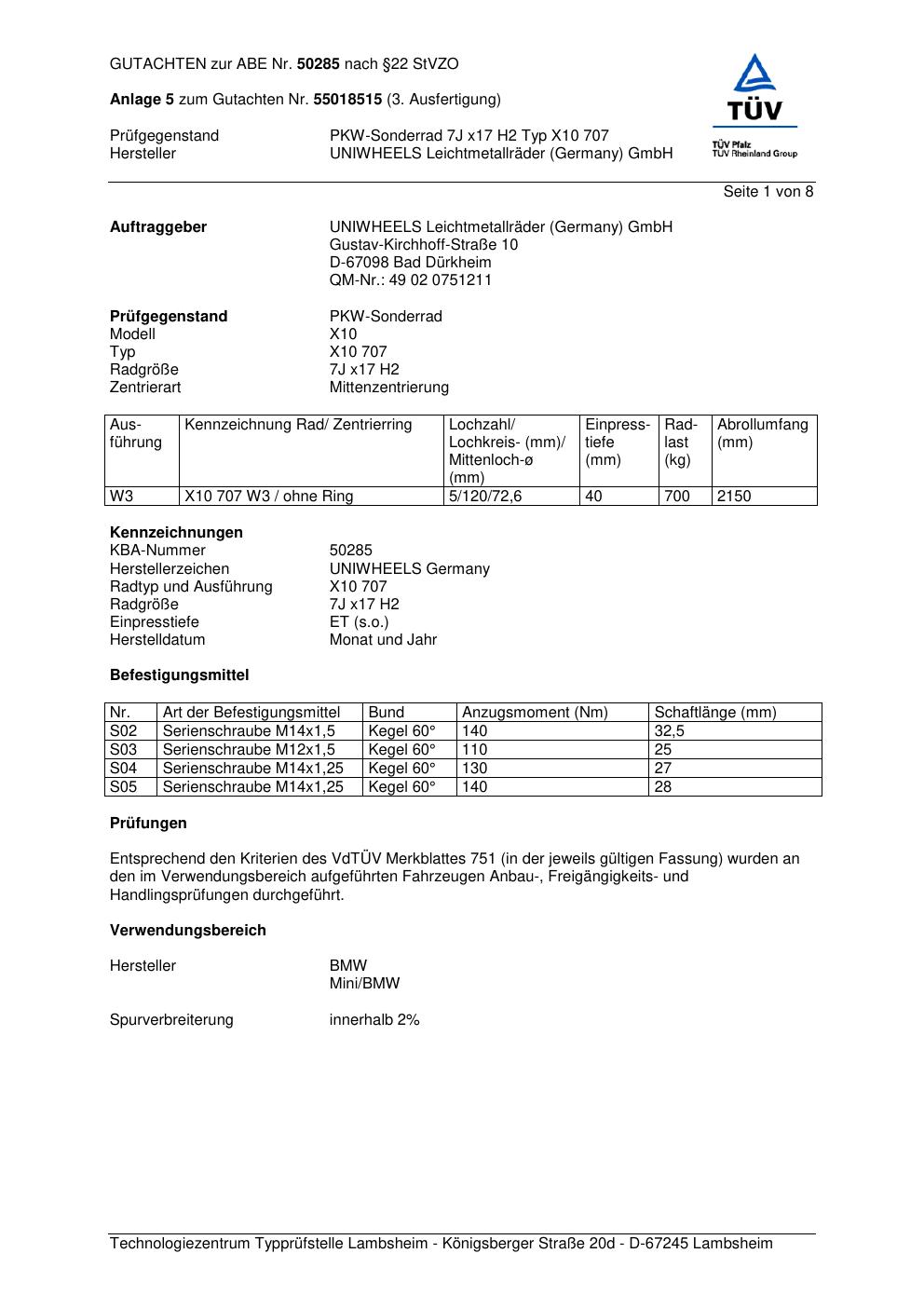 Dieses Gutachten (abe) bezieht sich auf die Alufelge UNIWHEELS X10 707 in der Ausführung ET 0, Mittenloch 0 mm (KBA 50285). Im PDF findest du typischerweise zulässige Reifengrößen, Auflagen/Anbauhinweise und – je nach Dokument – Hinweise zur Eintragung.