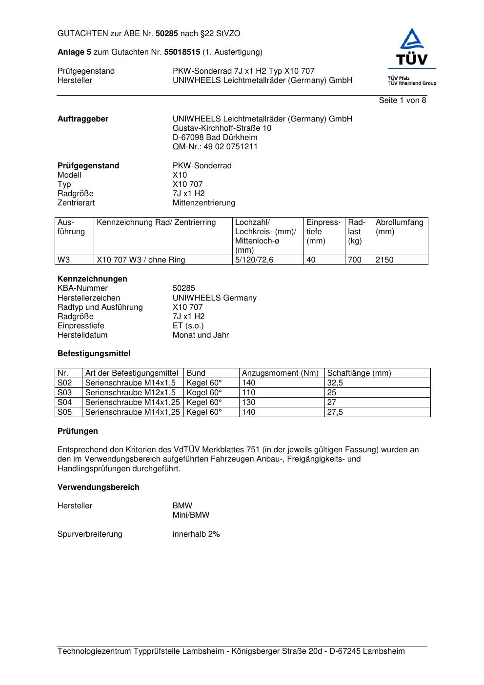 Dieses Gutachten (abe) bezieht sich auf die Alufelge UNIWHEELS X10 707 in der Ausführung ET 0, Mittenloch 0 mm (KBA 50285). Im PDF findest du typischerweise zulässige Reifengrößen, Auflagen/Anbauhinweise und – je nach Dokument – Hinweise zur Eintragung.