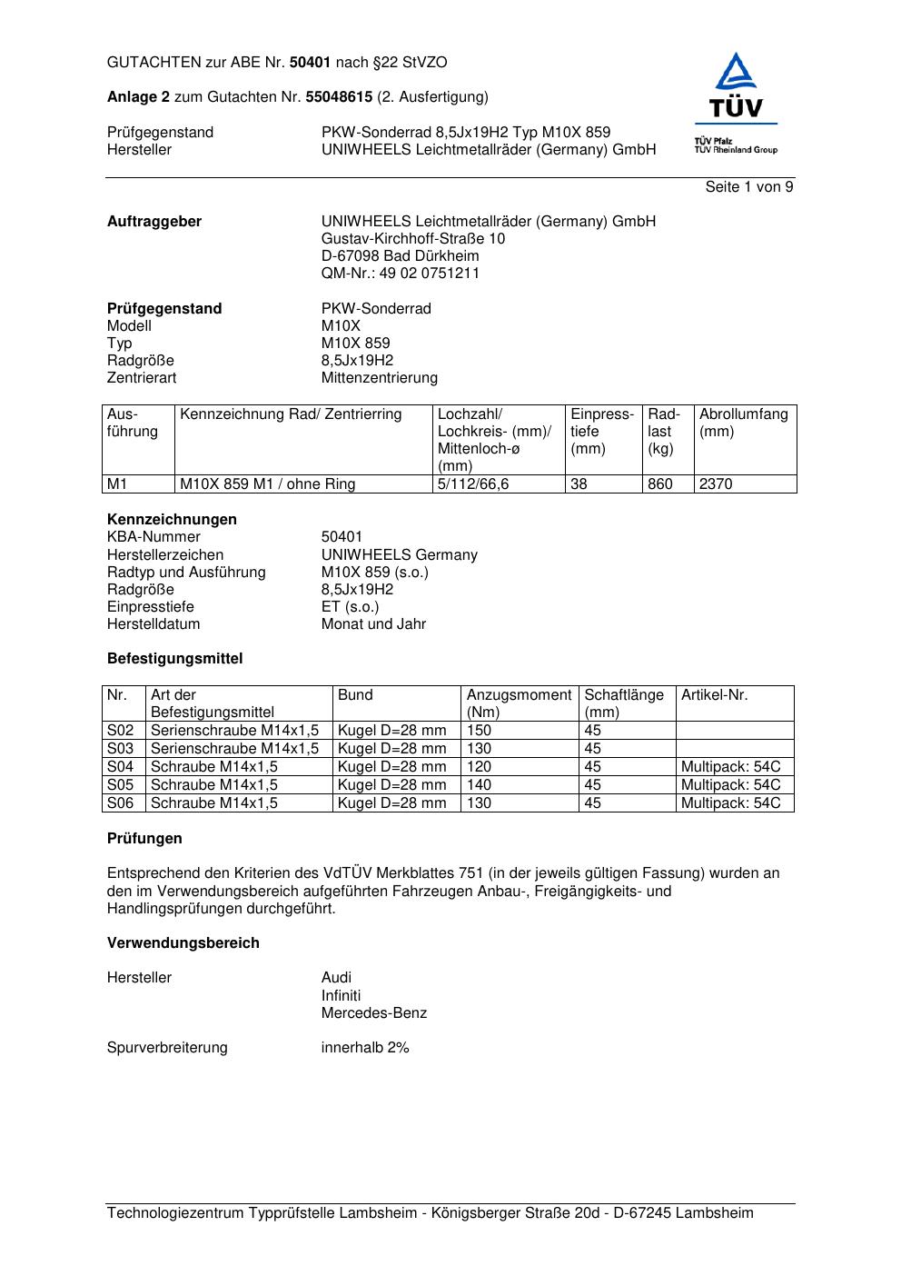 - UNIWHEELS Leichtmetallräder (Germany) GmbH M10X 859 – 0.0Jx0 ET0.0 (KBA 50401)