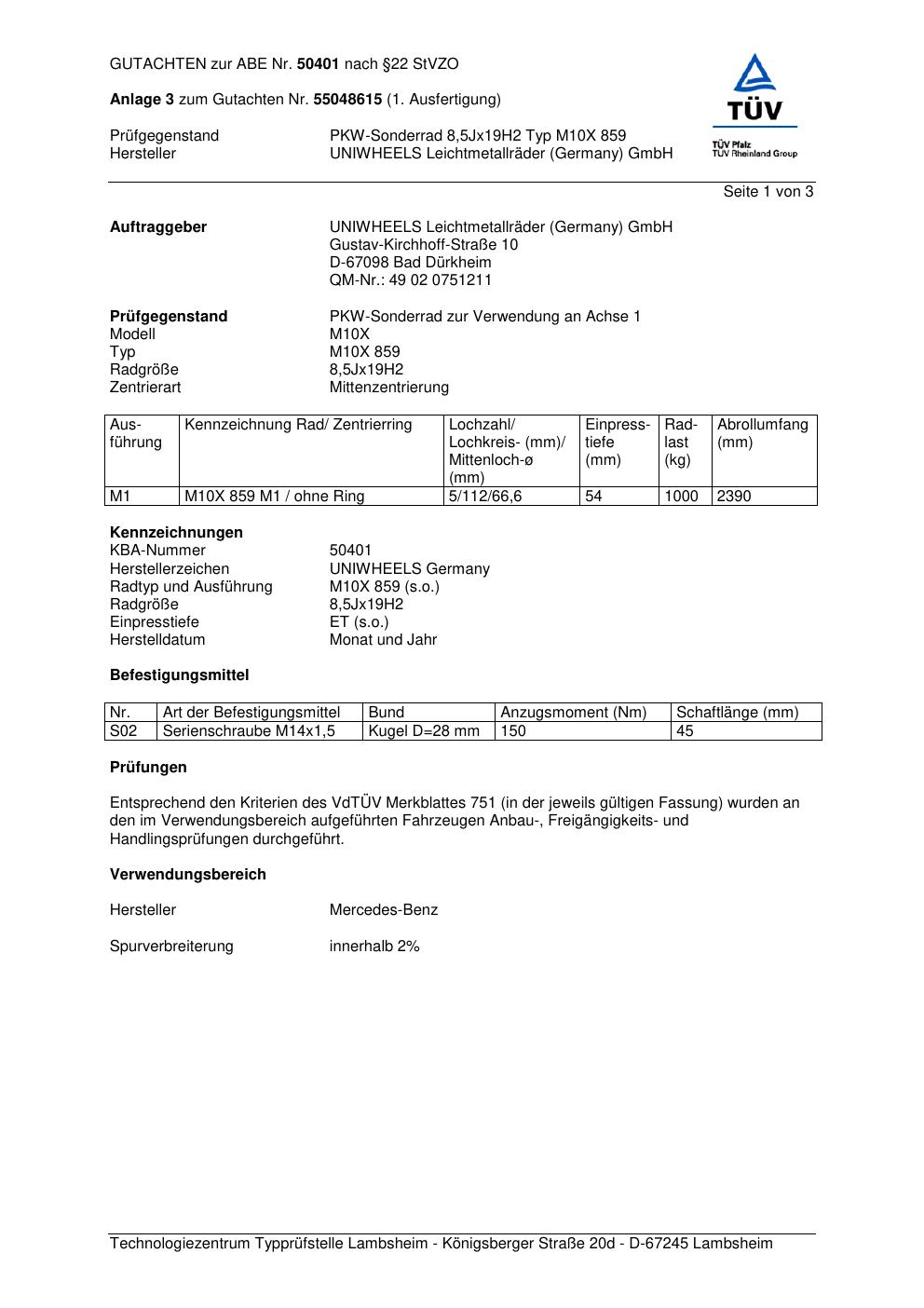 Felgengutachten / abe für Alufelgen UNIWHEELS M10X 859 (ET 0, Mittenloch 0 mm) mit KBA 50401 (Zertifikatsnummer 50401). Hier kostenlos als PDF herunterladen. Der Download-Link ist 24 Stunden gültig und kann bis zu zwei Mal verwendet werden.