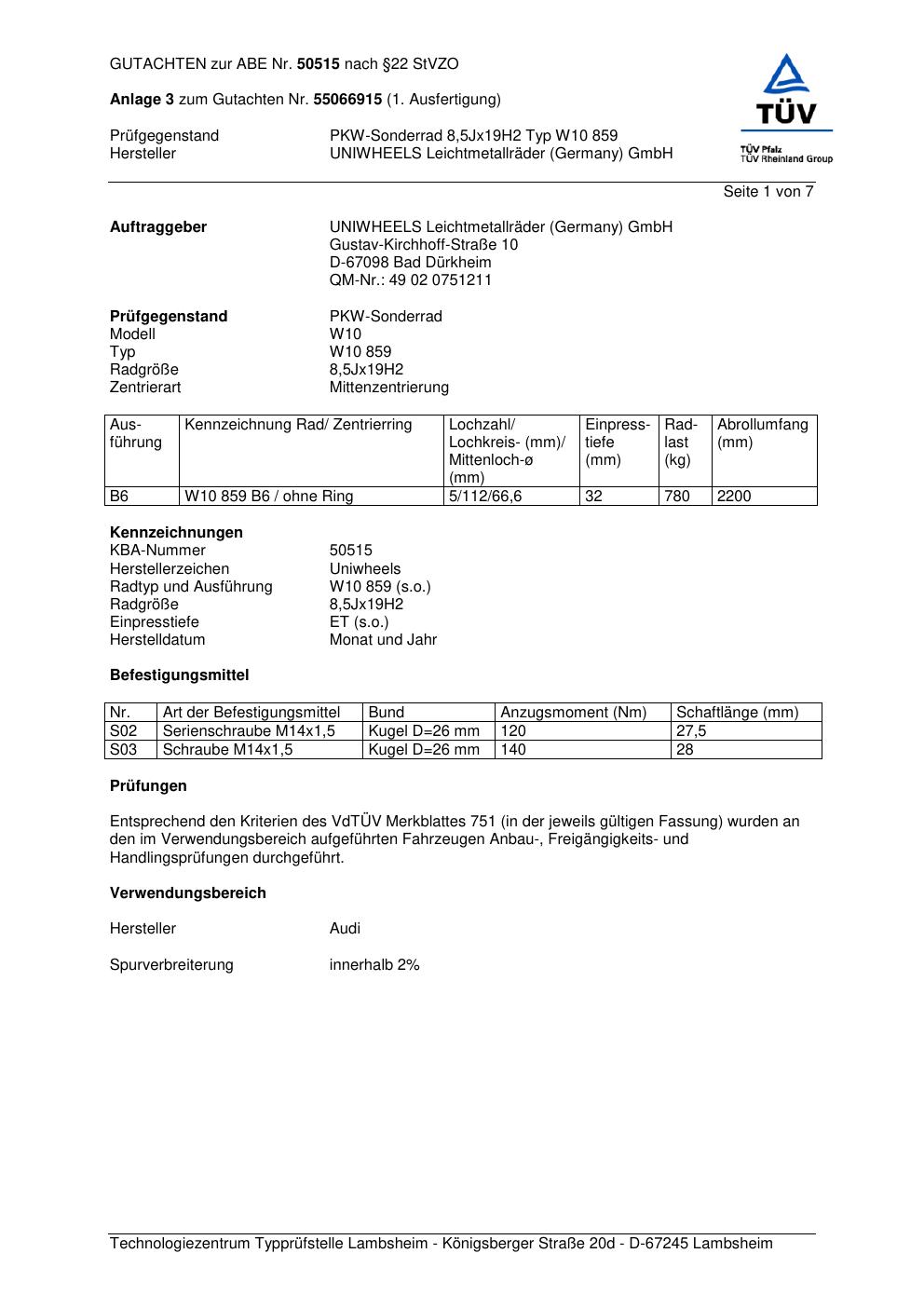 Dieses Gutachten (abe) bezieht sich auf die Alufelge Uniwheels W10 859 in der Ausführung ET 0, Mittenloch 0 mm (KBA 50515). Im PDF findest du typischerweise zulässige Reifengrößen, Auflagen/Anbauhinweise und – je nach Dokument – Hinweise zur Eintragung.