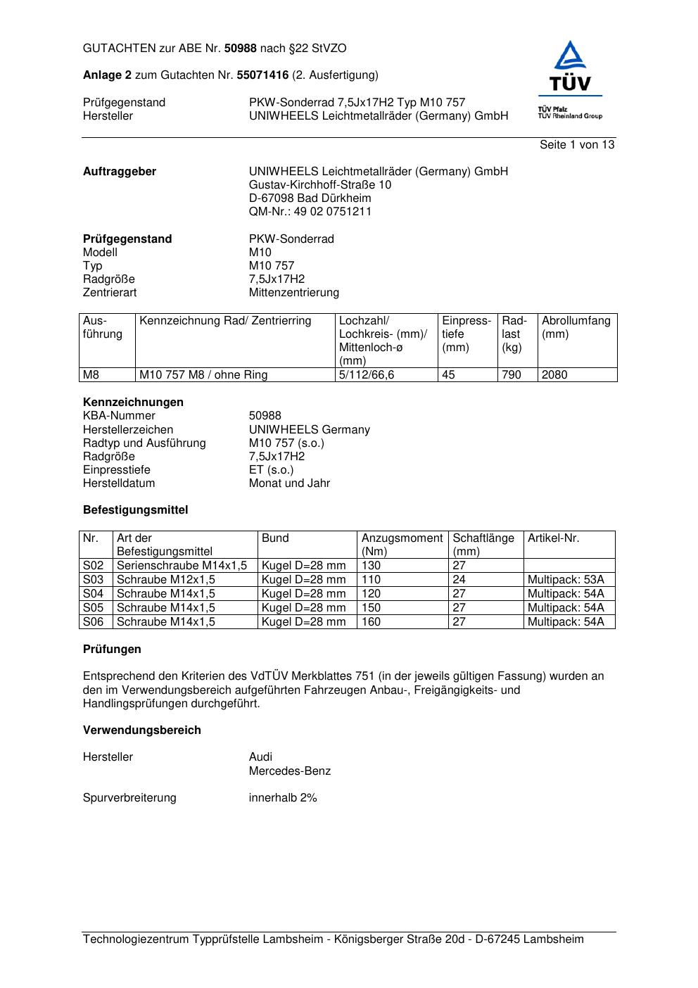 Dieses Gutachten (abe) bezieht sich auf die Alufelge UNIWHEELS M10 757 in der Ausführung ET 0, Mittenloch 0 mm (KBA 50988). Im PDF findest du typischerweise zulässige Reifengrößen, Auflagen/Anbauhinweise und – je nach Dokument – Hinweise zur Eintragung.